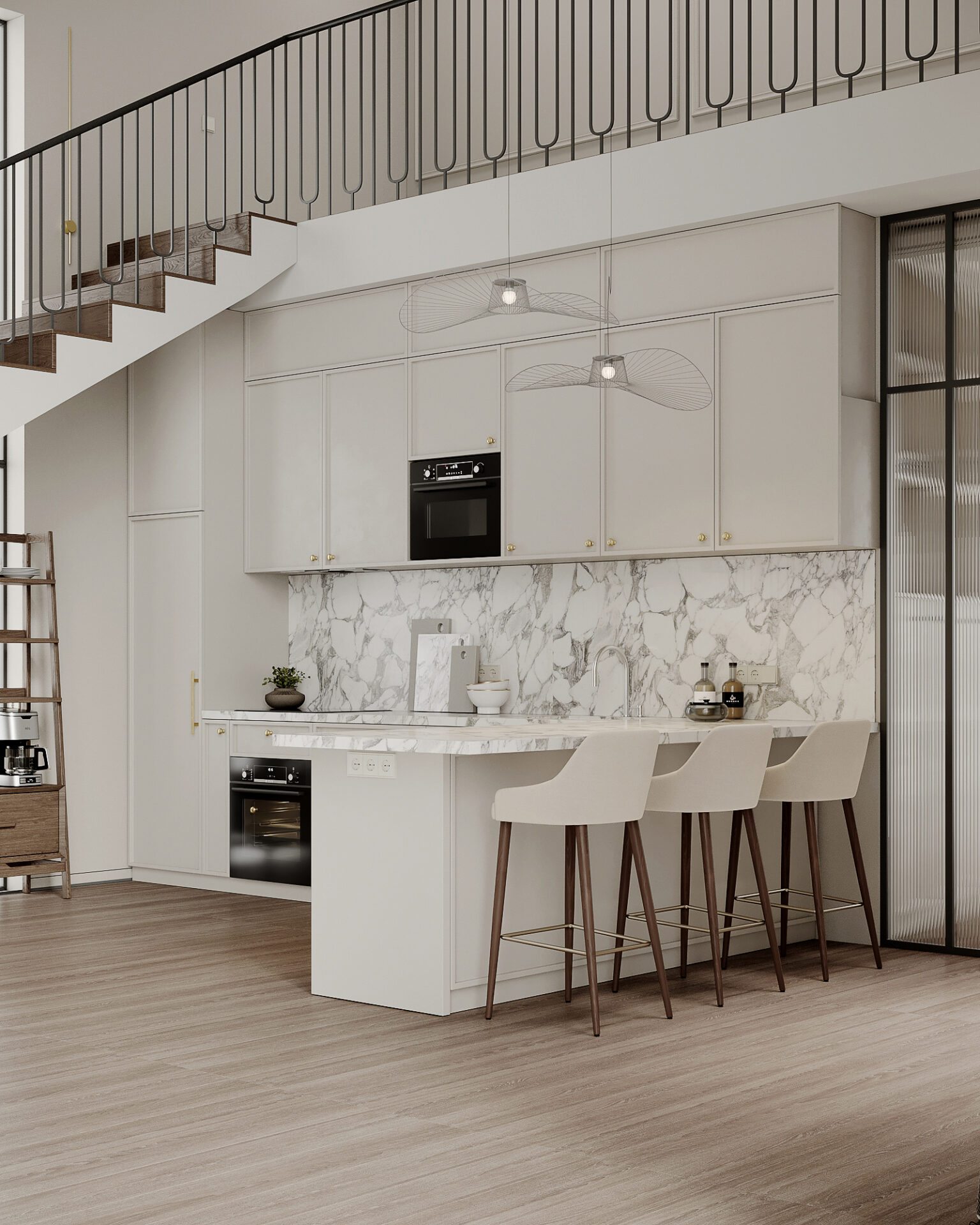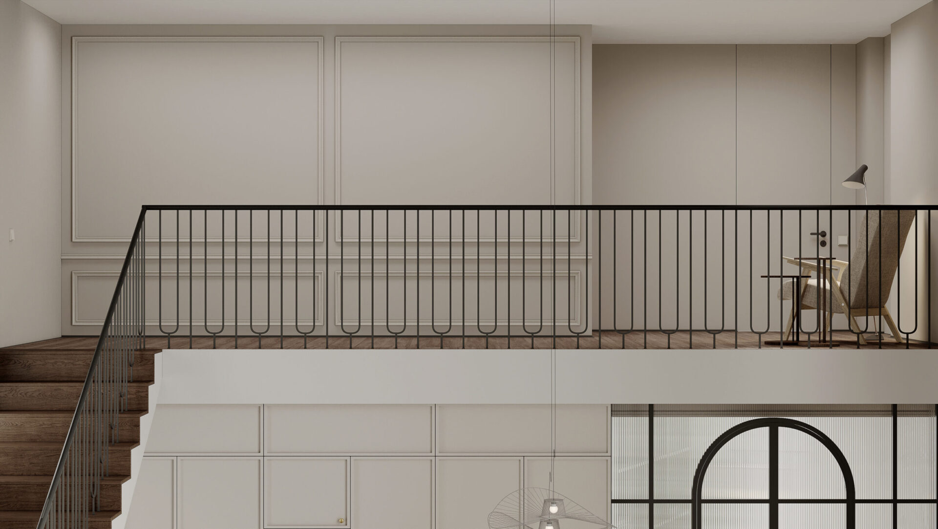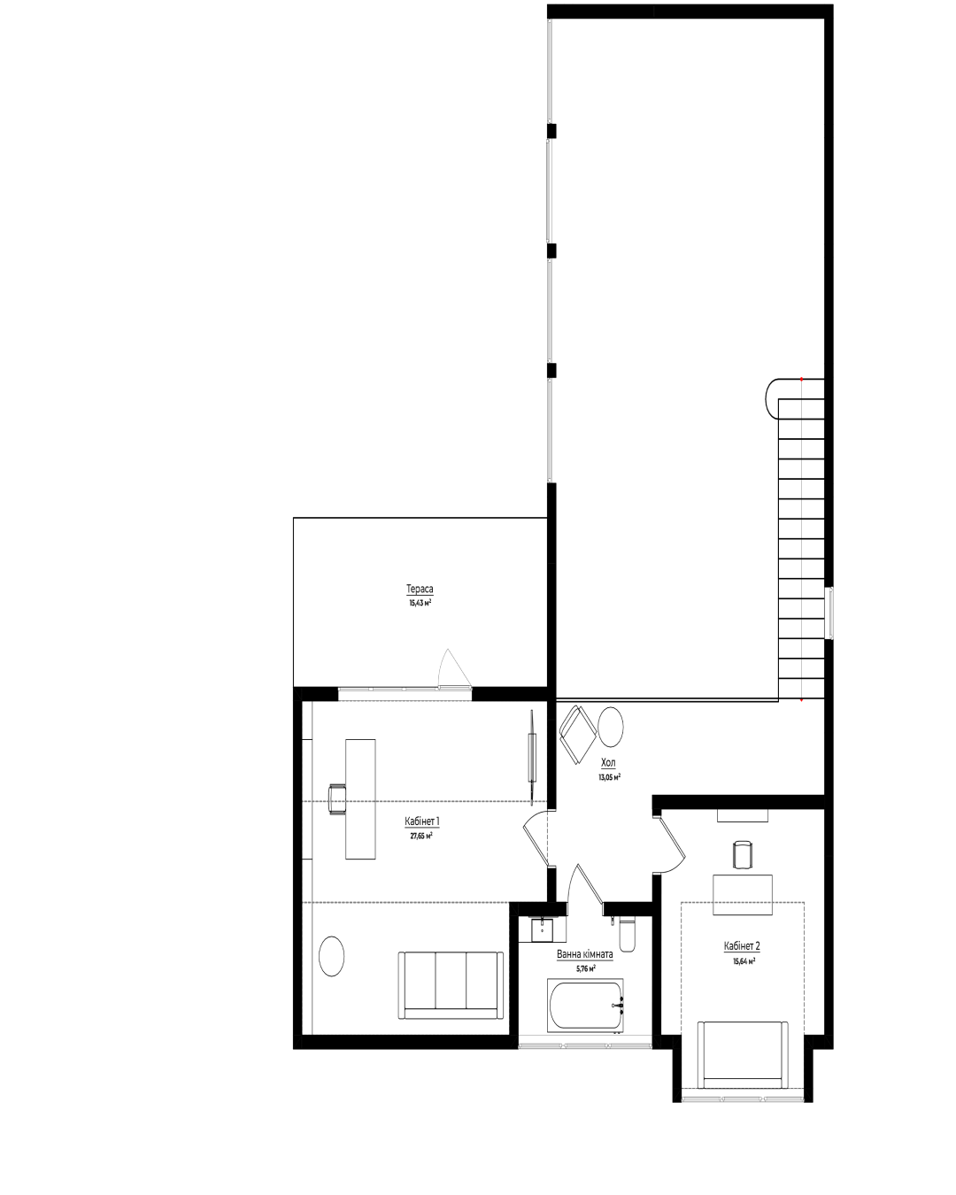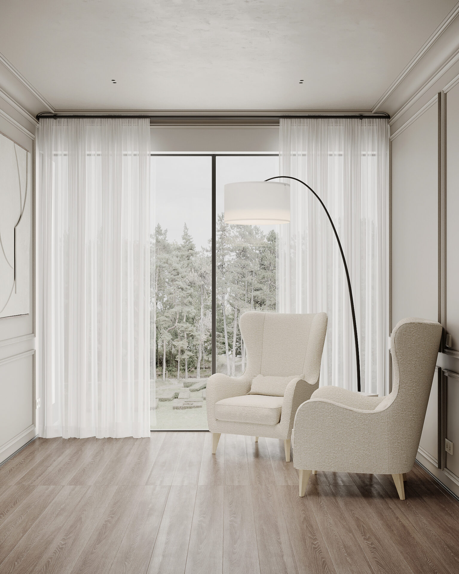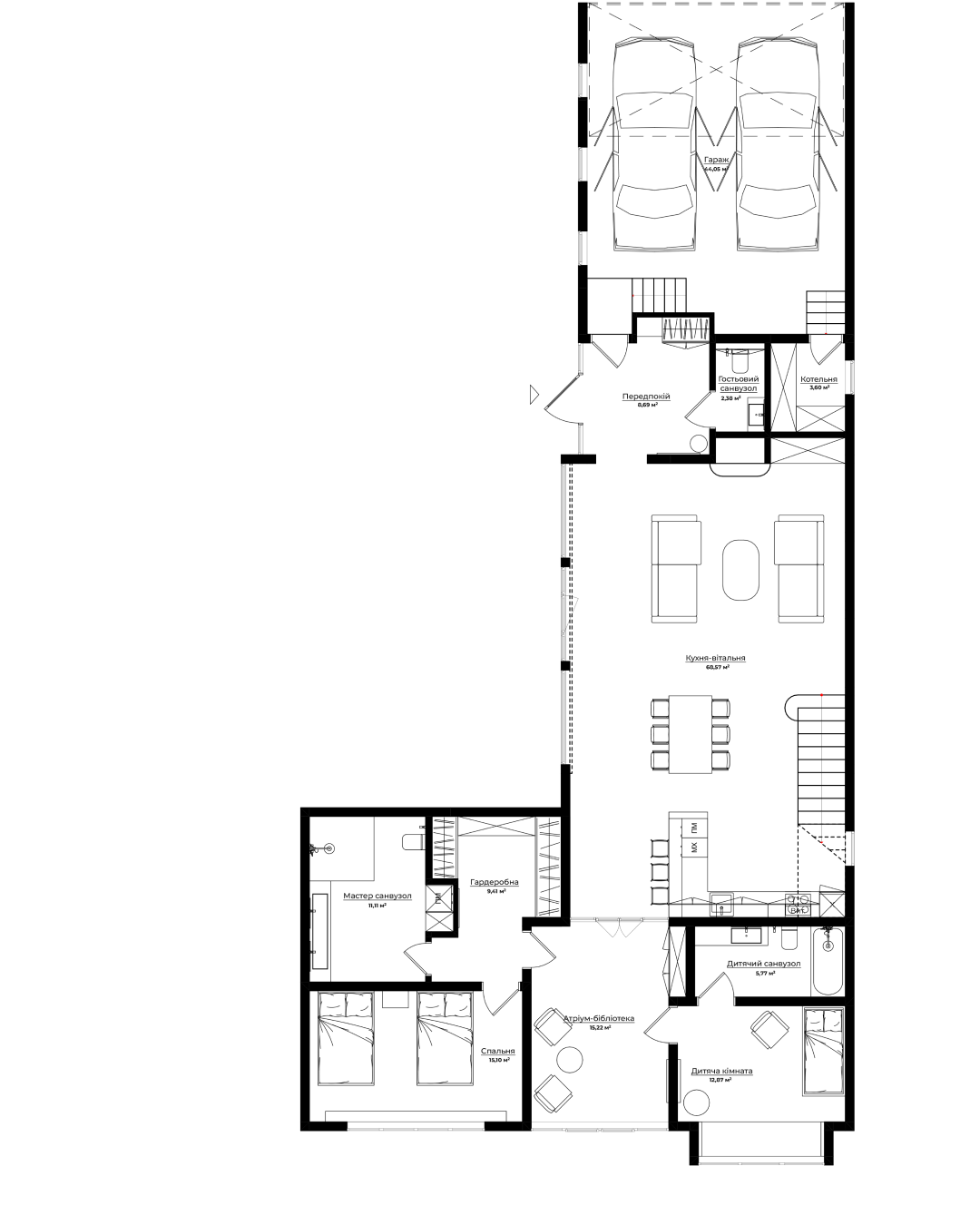 Будинок у стилі фахверк. Інтер’єр цього будинку розроблявся паралельно з архітектурним проєктом. В основу концепції лягла американська класика та елементи мінімалізму. Простір поділений на три зони: гостьову – для спільного проведення часу, приватну – з окремими спальнями та санвузлами, а також робочу – з окремими кабінетами.