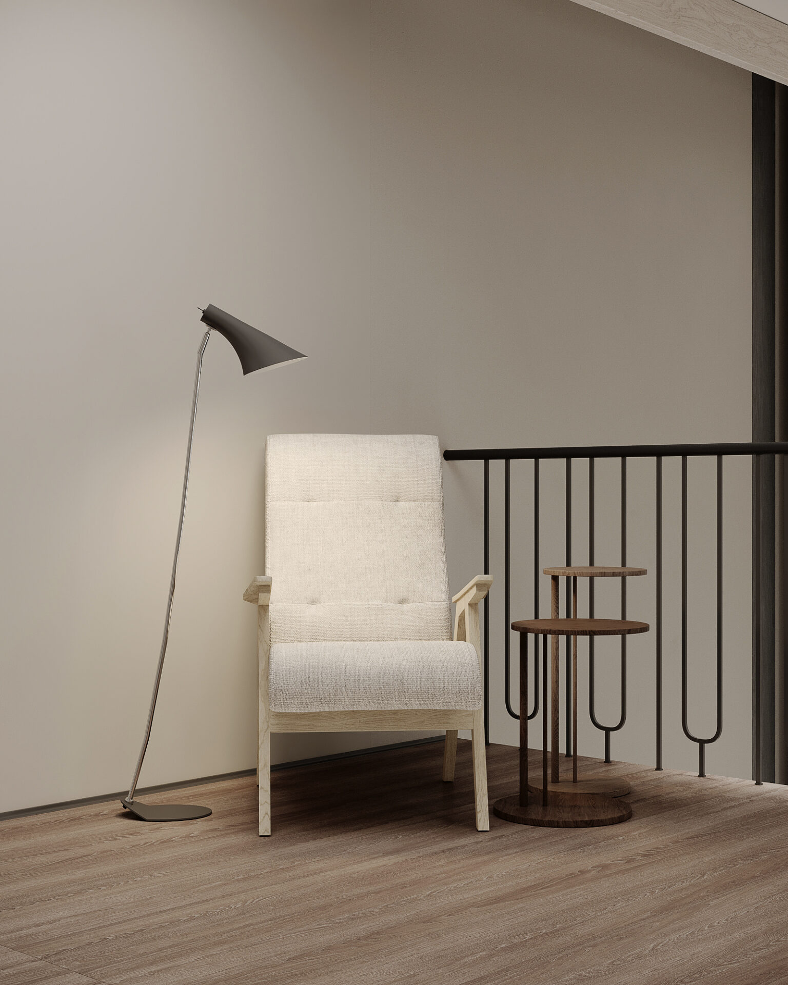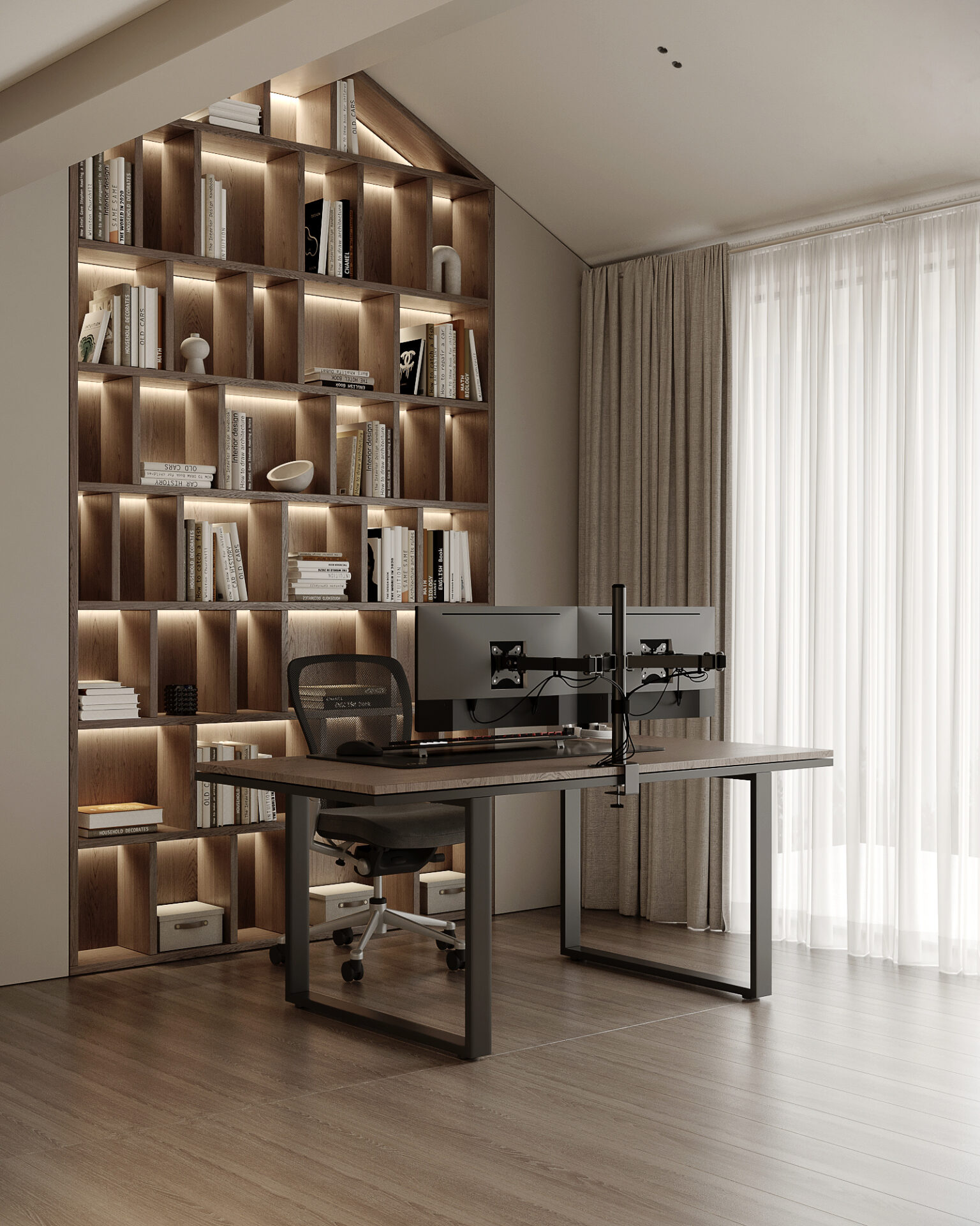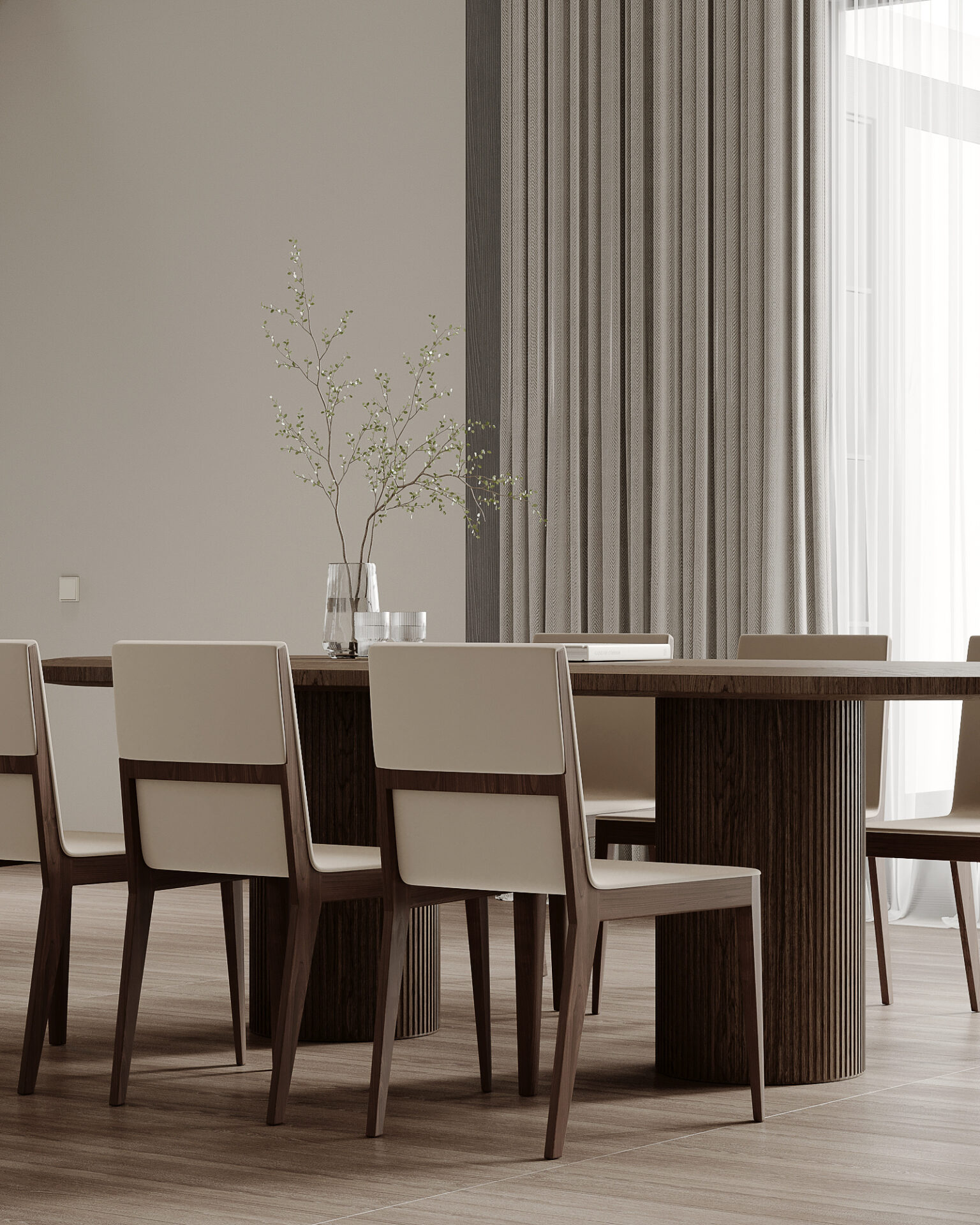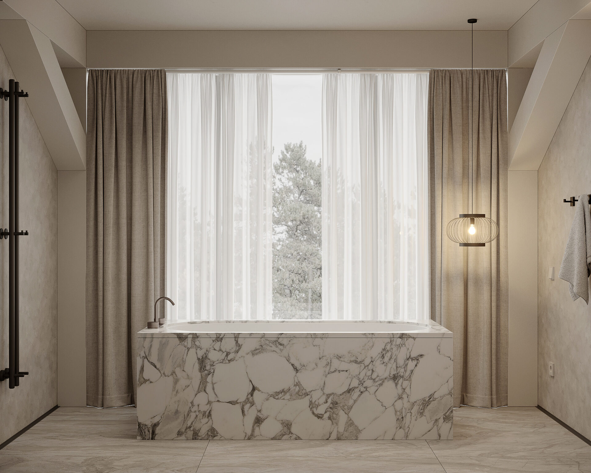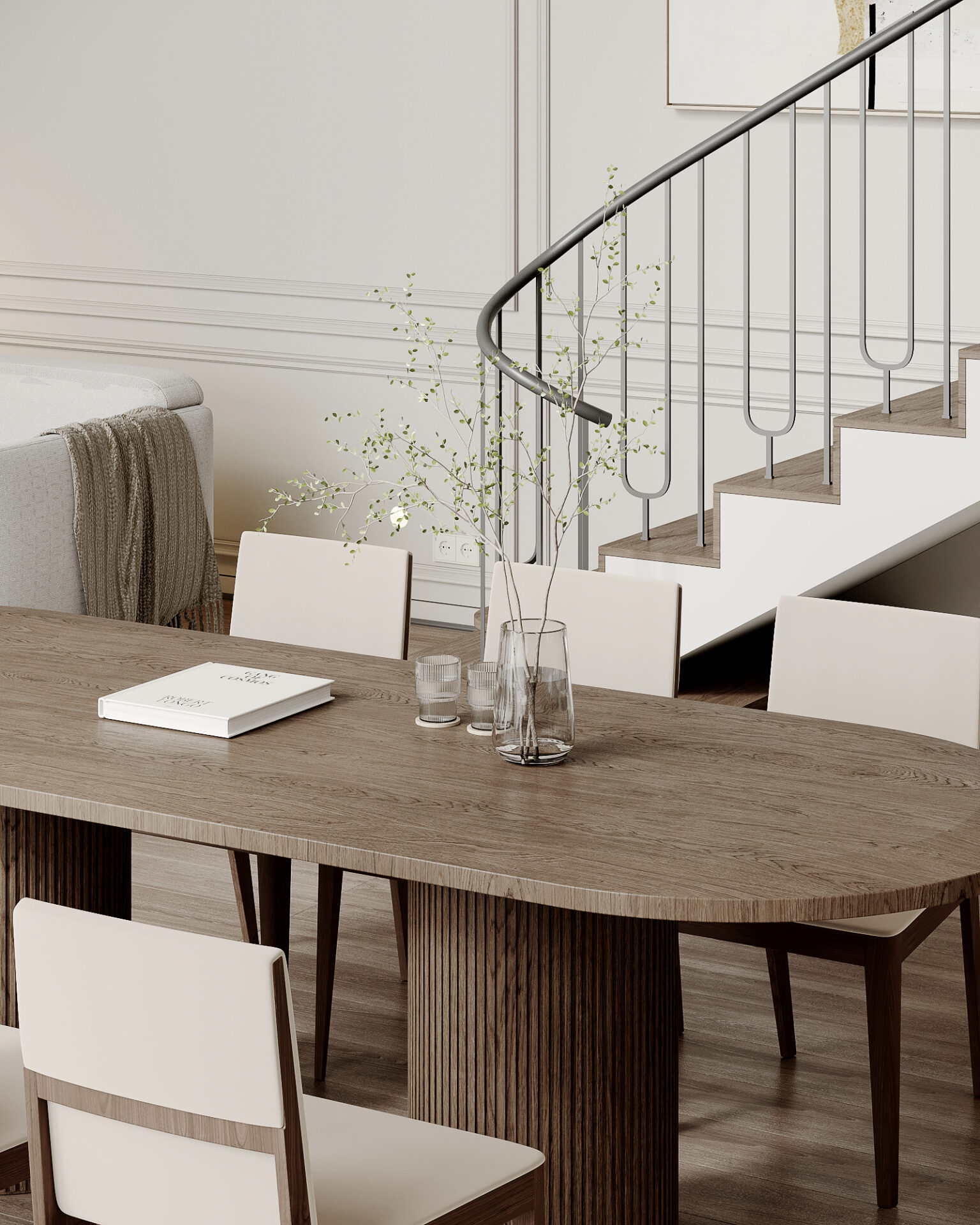 Будинок у стилі фахверк. Інтер’єр цього будинку розроблявся паралельно з архітектурним проєктом. В основу концепції лягла американська класика та елементи мінімалізму. Простір поділений на три зони: гостьову – для спільного проведення часу, приватну – з окремими спальнями та санвузлами, а також робочу – з окремими кабінетами.