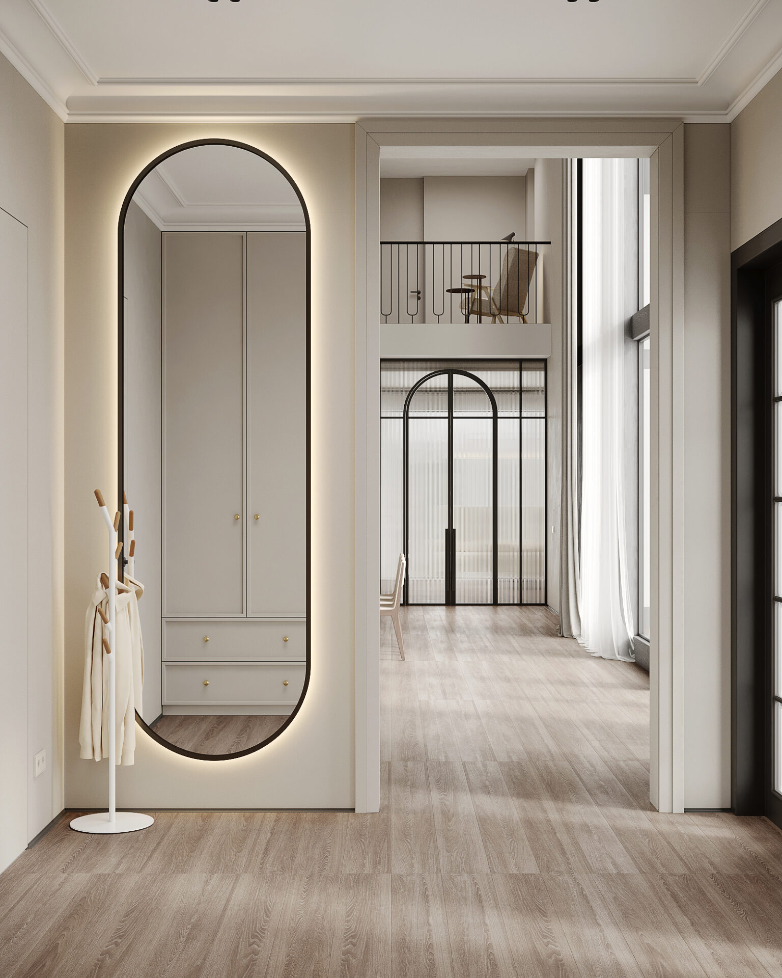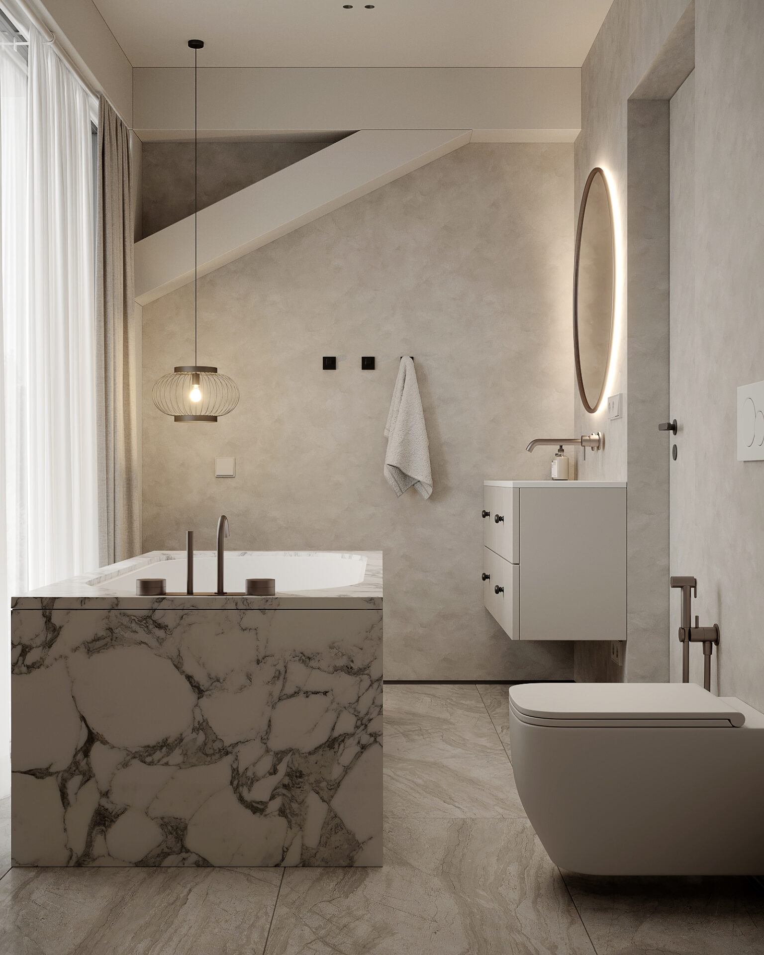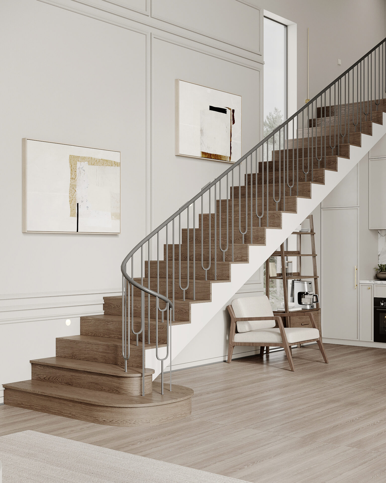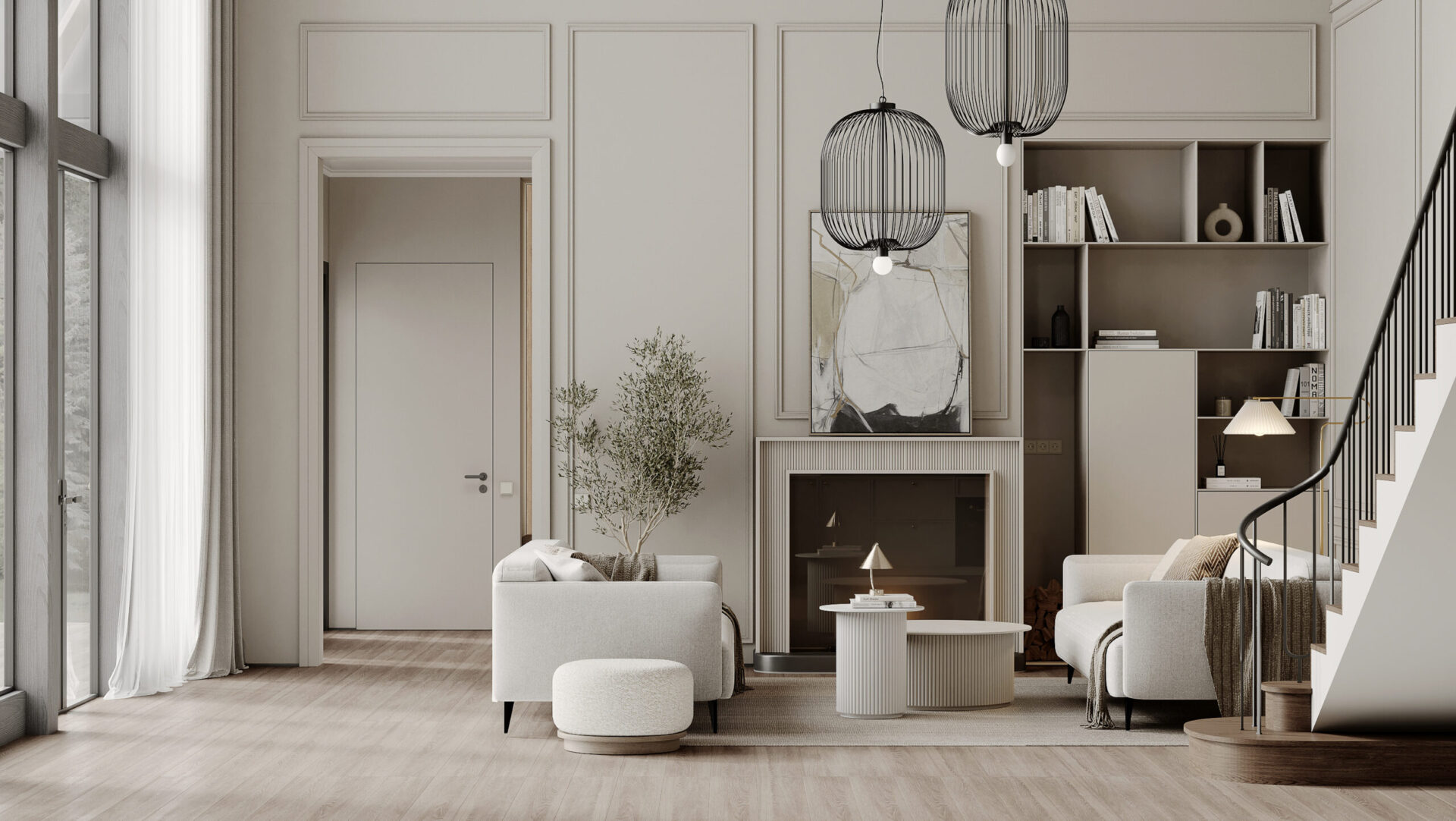Будинок у стилі фахверк. Інтер’єр цього будинку розроблявся паралельно з архітектурним проєктом. В основу концепції лягла американська класика та елементи мінімалізму. Простір поділений на три зони: гостьову – для спільного проведення часу, приватну – з окремими спальнями та санвузлами, а також робочу – з окремими кабінетами.