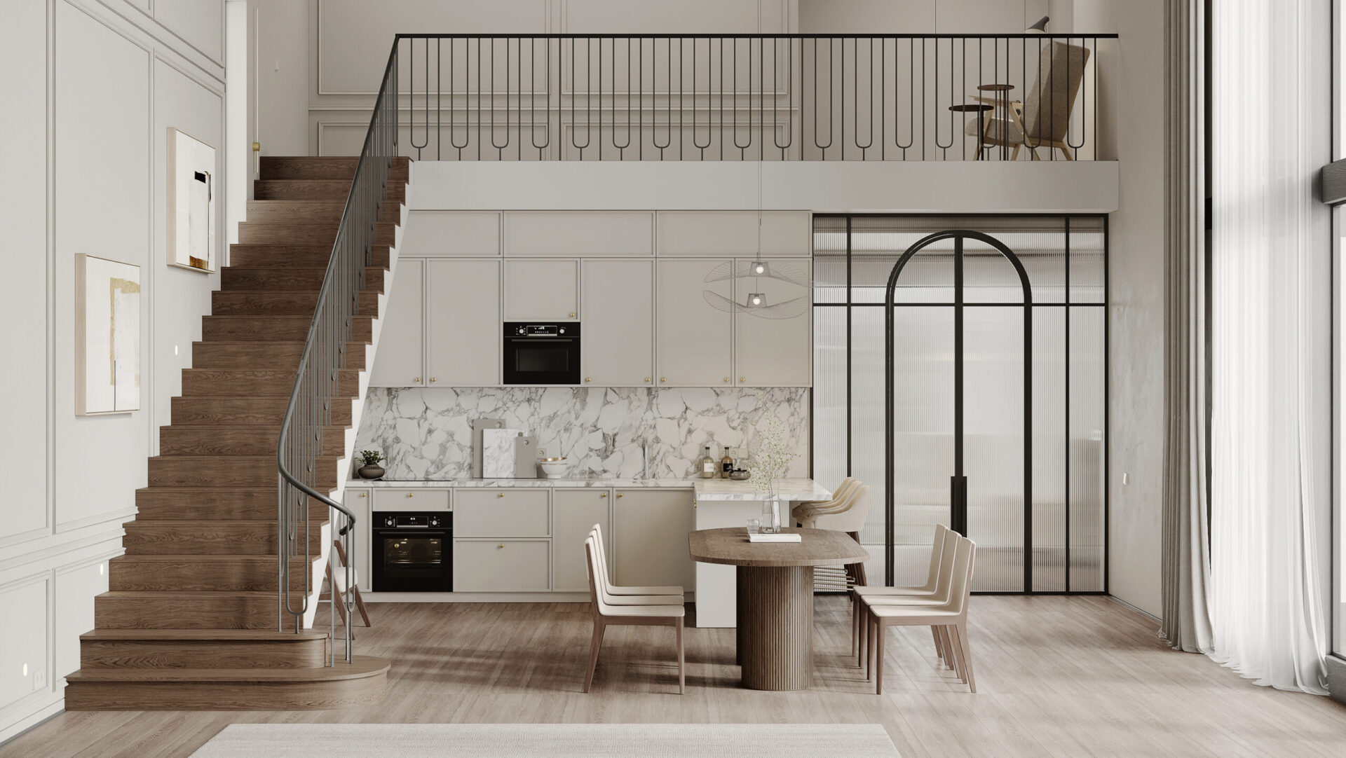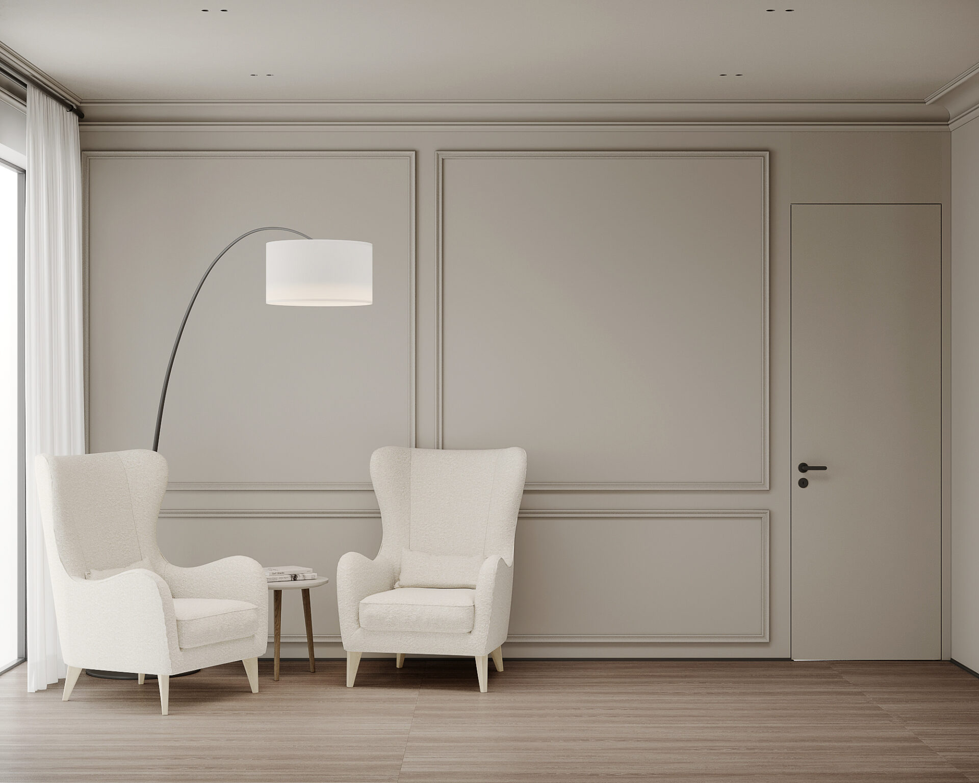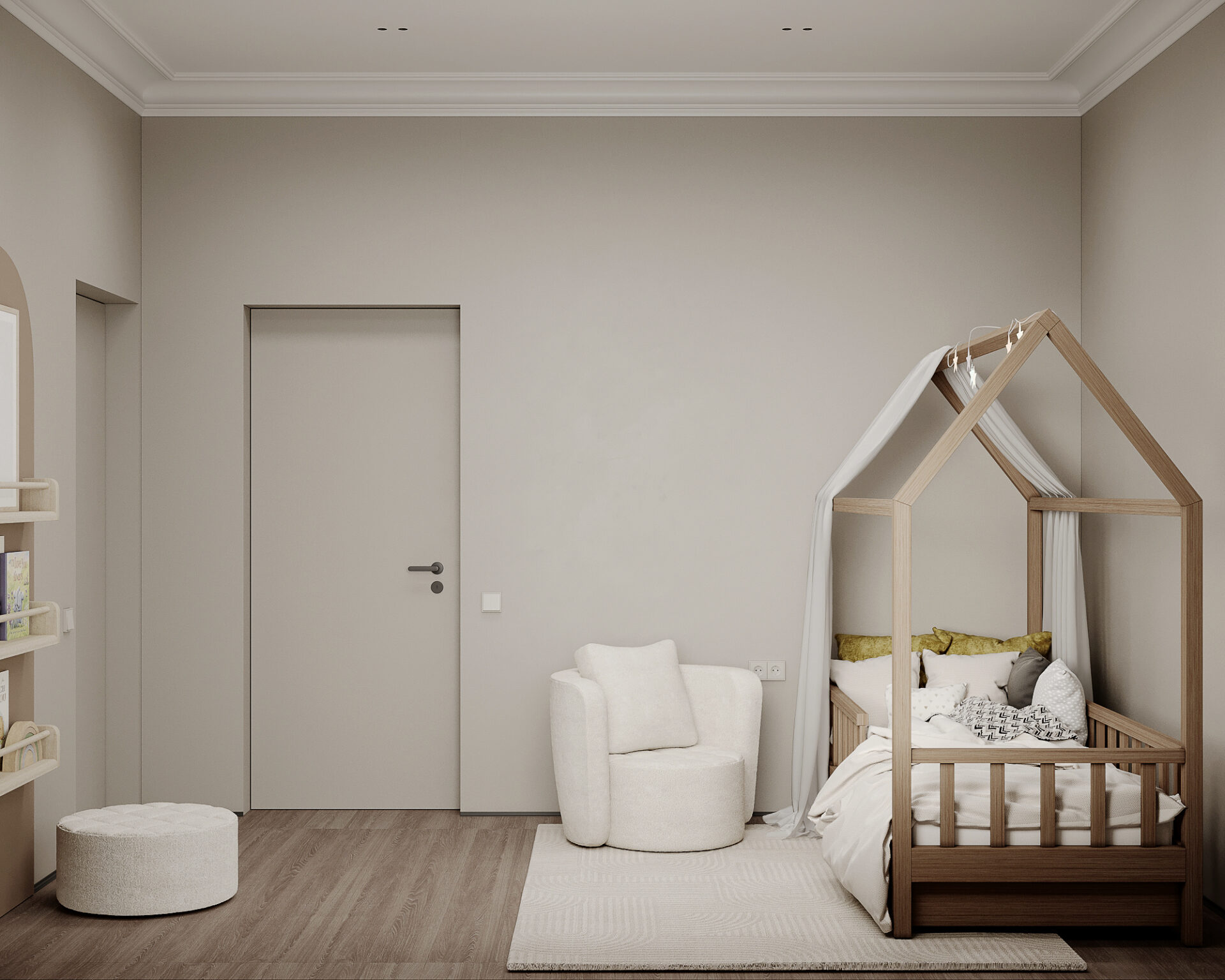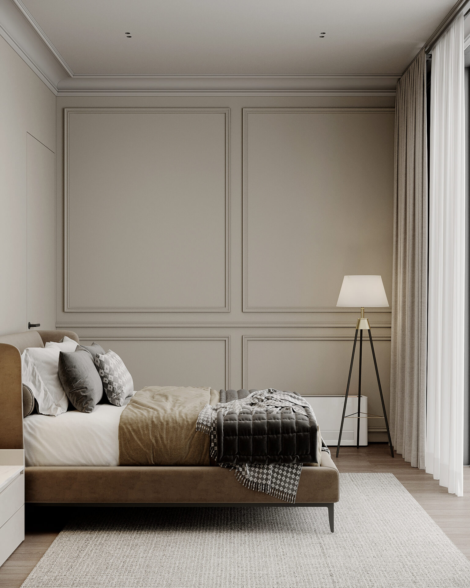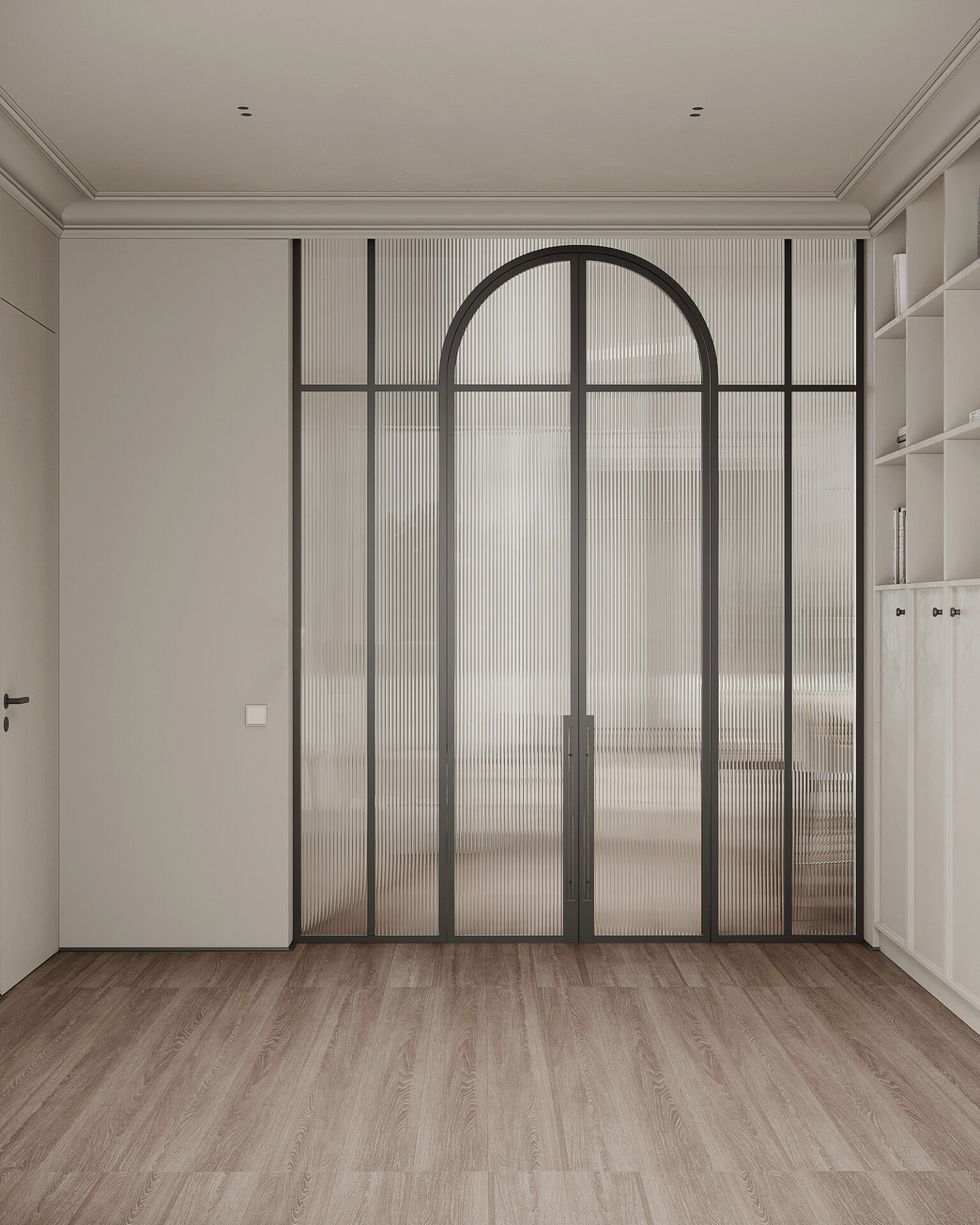 Будинок у стилі фахверк. Інтер’єр цього будинку розроблявся паралельно з архітектурним проєктом. В основу концепції лягла американська класика та елементи мінімалізму. Простір поділений на три зони: гостьову – для спільного проведення часу, приватну – з окремими спальнями та санвузлами, а також робочу – з окремими кабінетами.