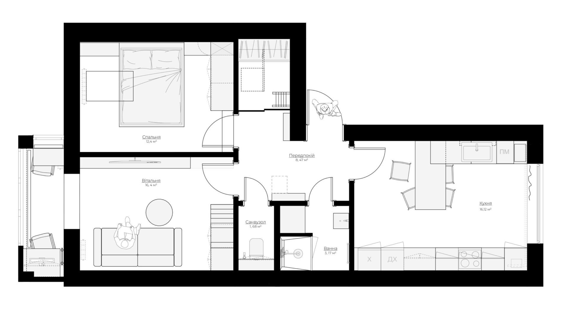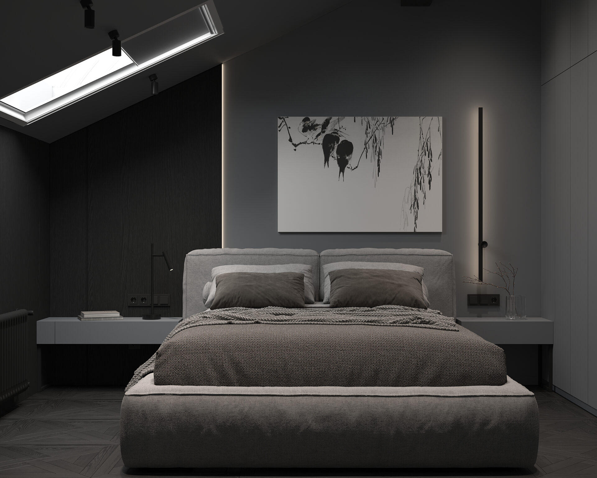 Квартира з нестандартною архітектурою стелі через багатощипцевий дах — цей елемент став головною прикрасою майбутнього житла, дозволивши реалізувати унікальні функціональні рішення. В основу інтер’єру ліг мінімалізм, однак концептуально ми надали йому Японського вайбу.