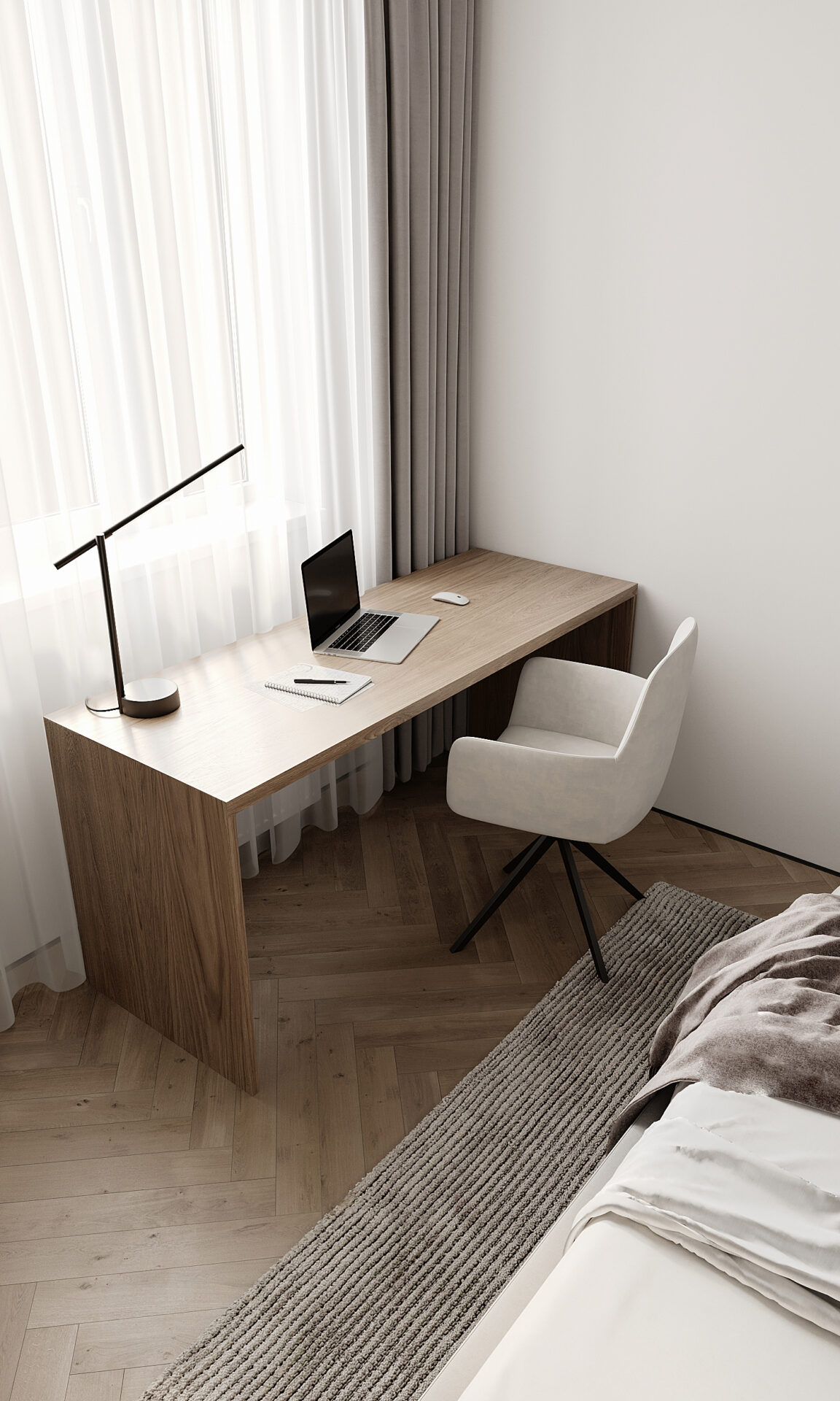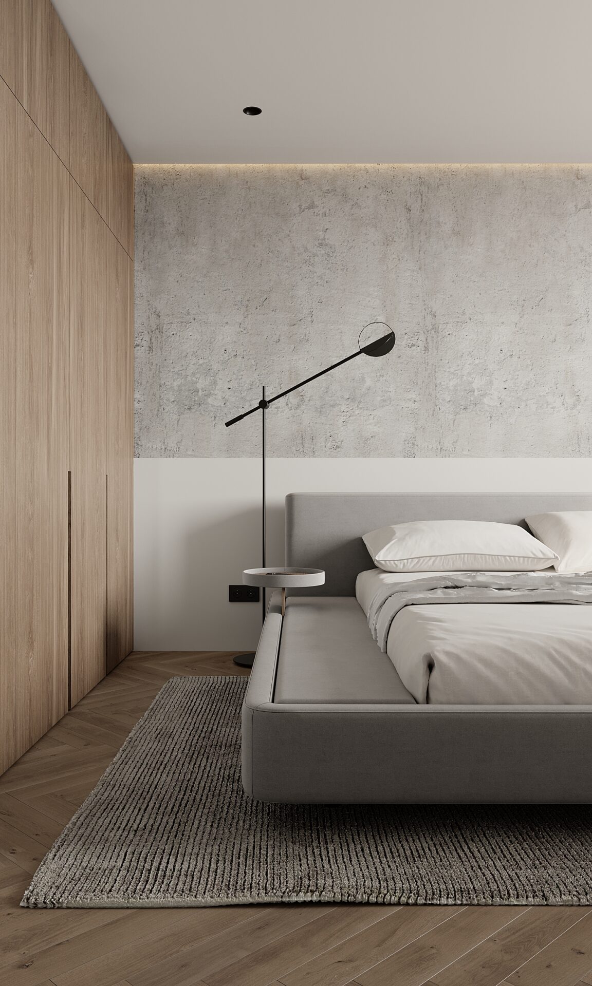 Стиль – мінімалізм. Все виконано в світлих тонах з поєднанням дерева та сірих фактурних акцентів.