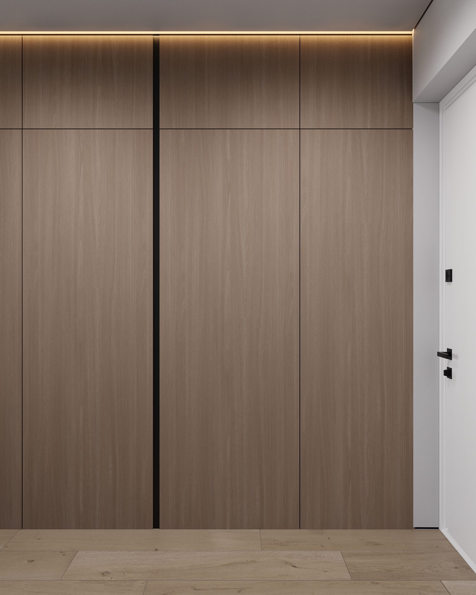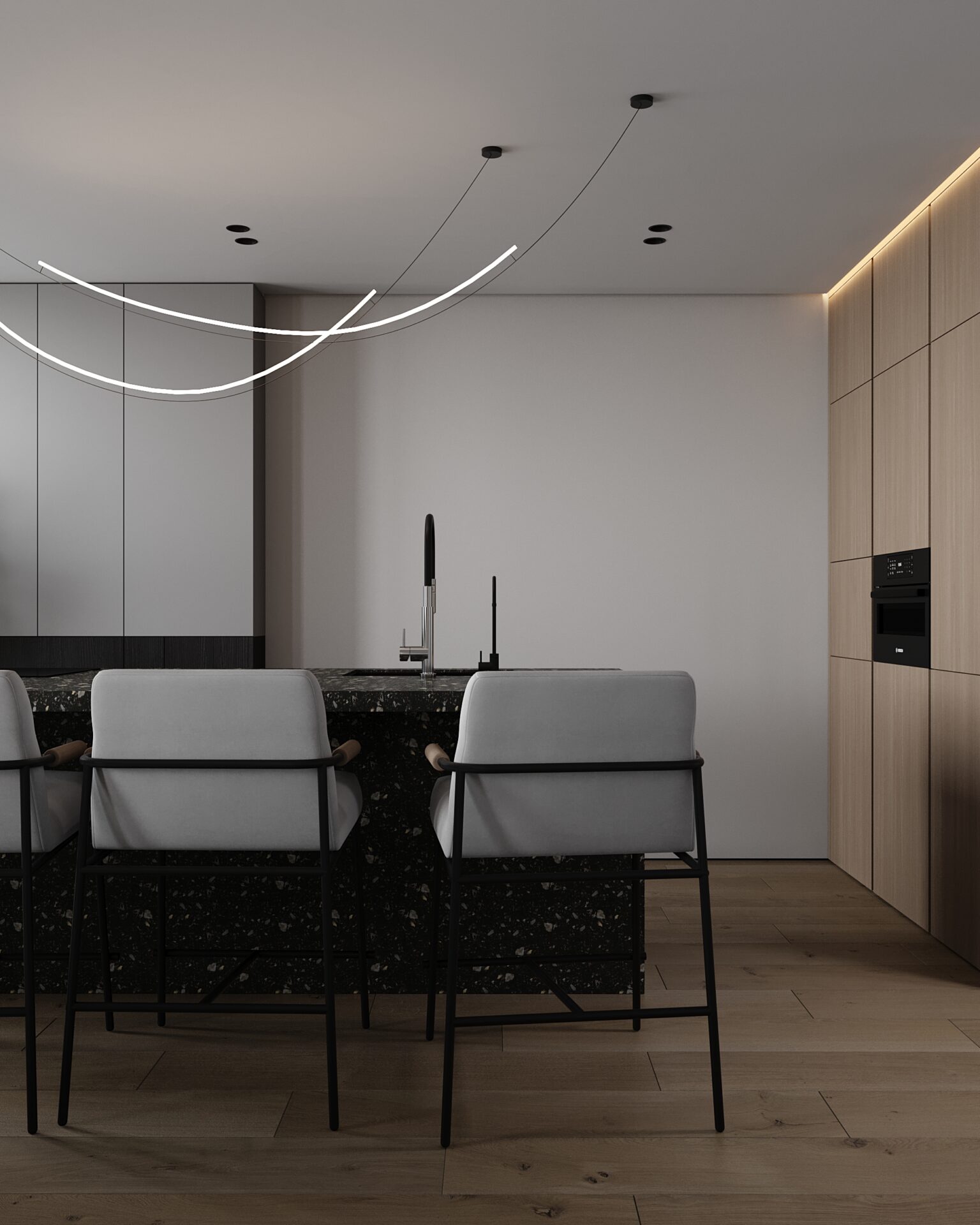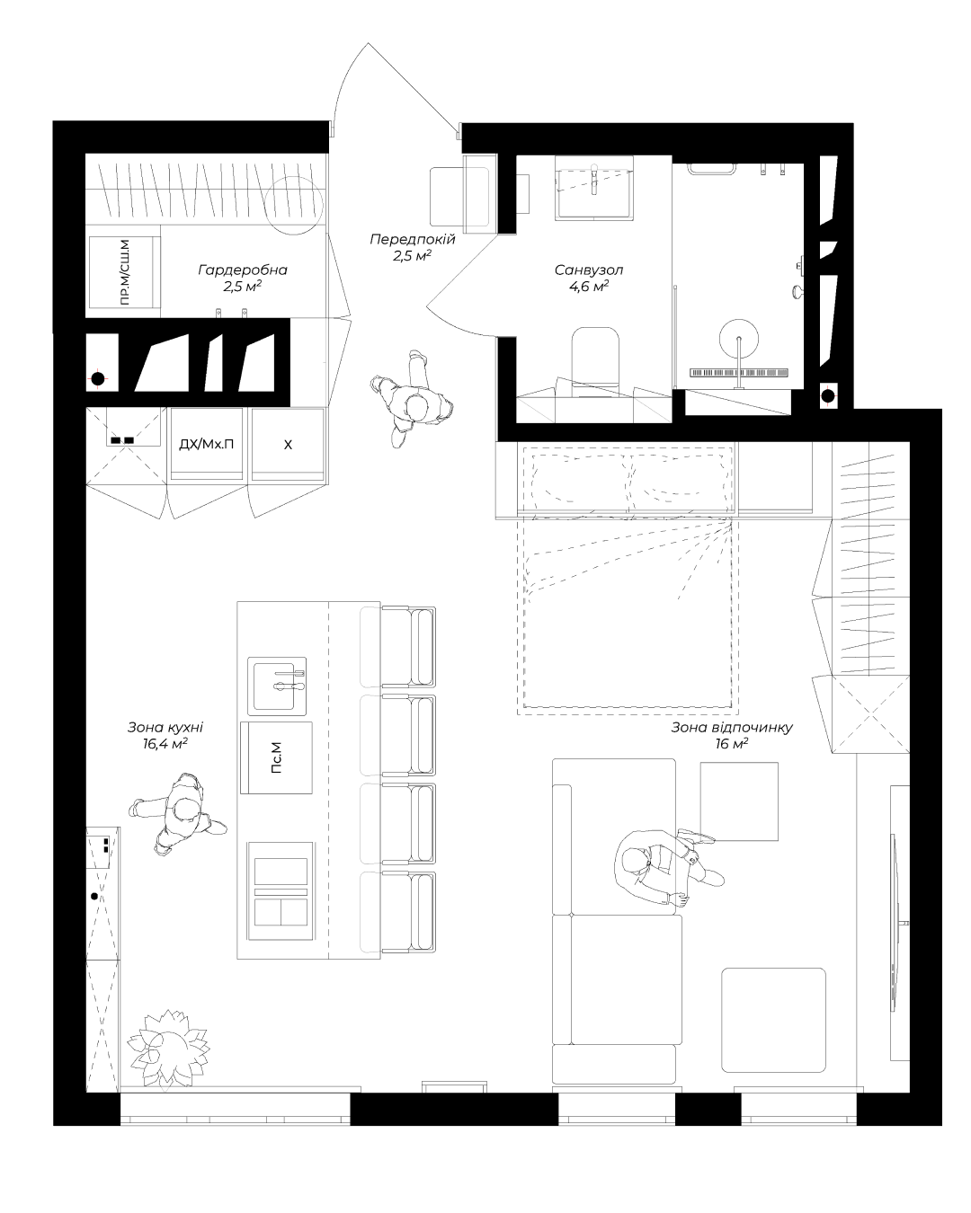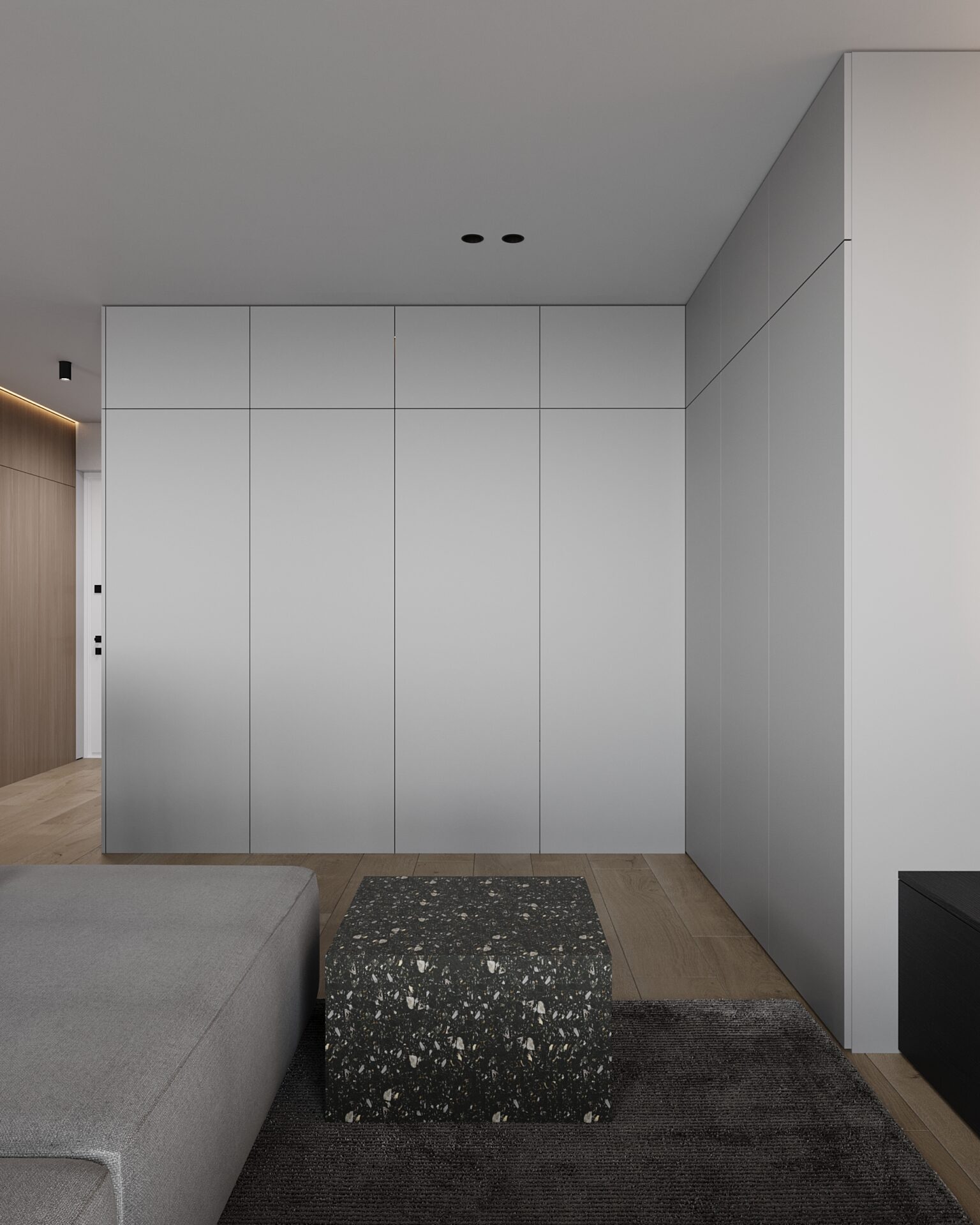 Мінімалістичний, подекуди, брутальний стиль підкреслює лайфстайл нашого замовника. Ми об’єднали всю квартиру в єдиний open space, зберігши чітку зональність для кожного функціонального блоку. А однією з ключових ідей стало приховане ліжко у одній з шаф.
