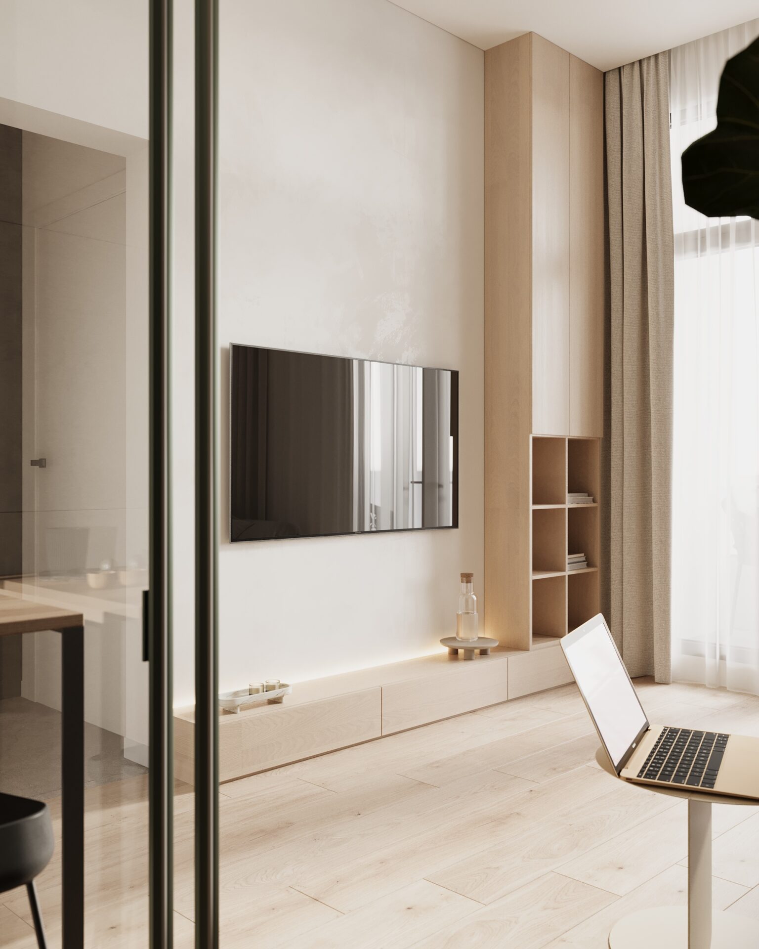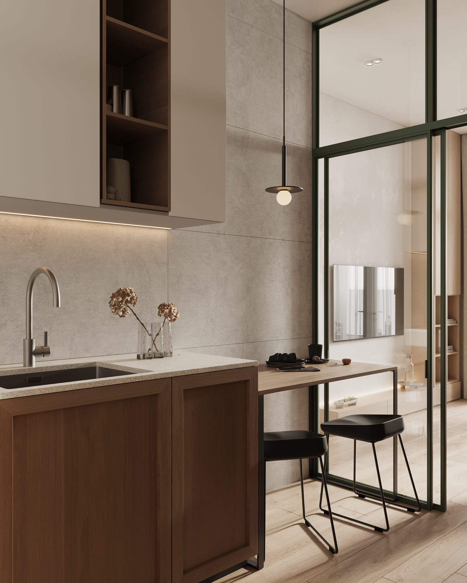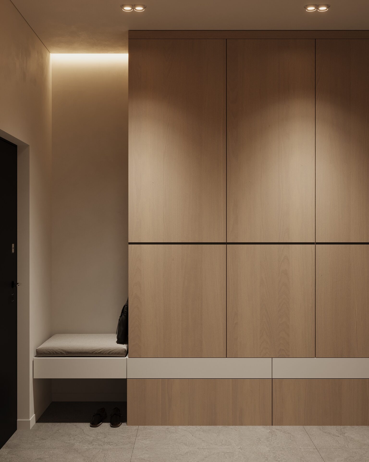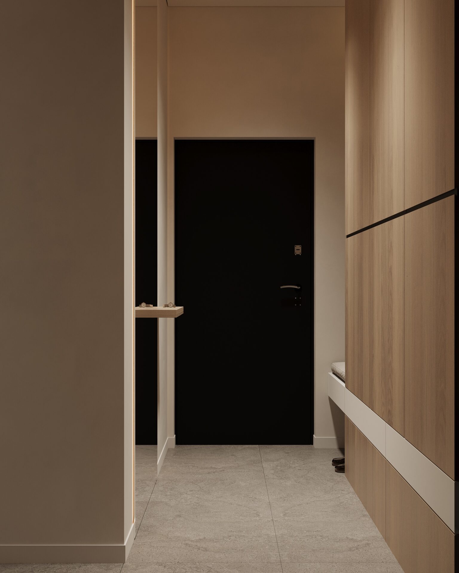 Квартира у сучасному мінімалістичному стилі. У світлих тонах, з використанням теплих природних відтінків та акцентів зеленого кольору. Традиційно для об’єктів малої площі ми передбачили велику кількість вбудованих меблів, які візуально не загромаджують простір, але забезпечують необхідну функціональність житла.