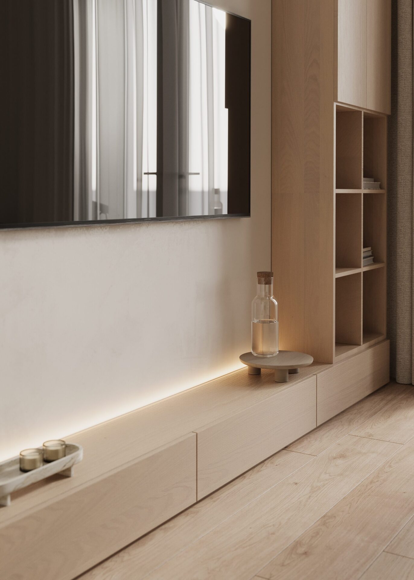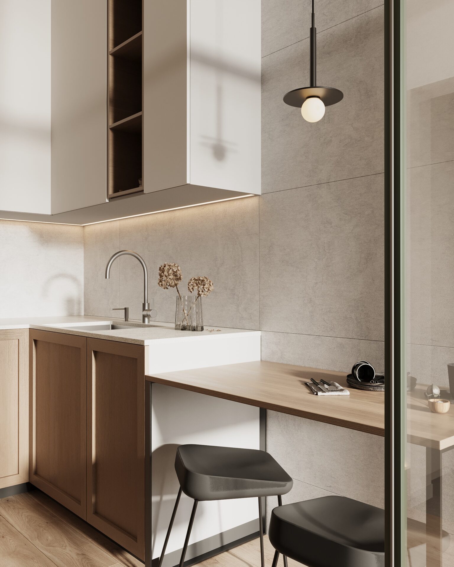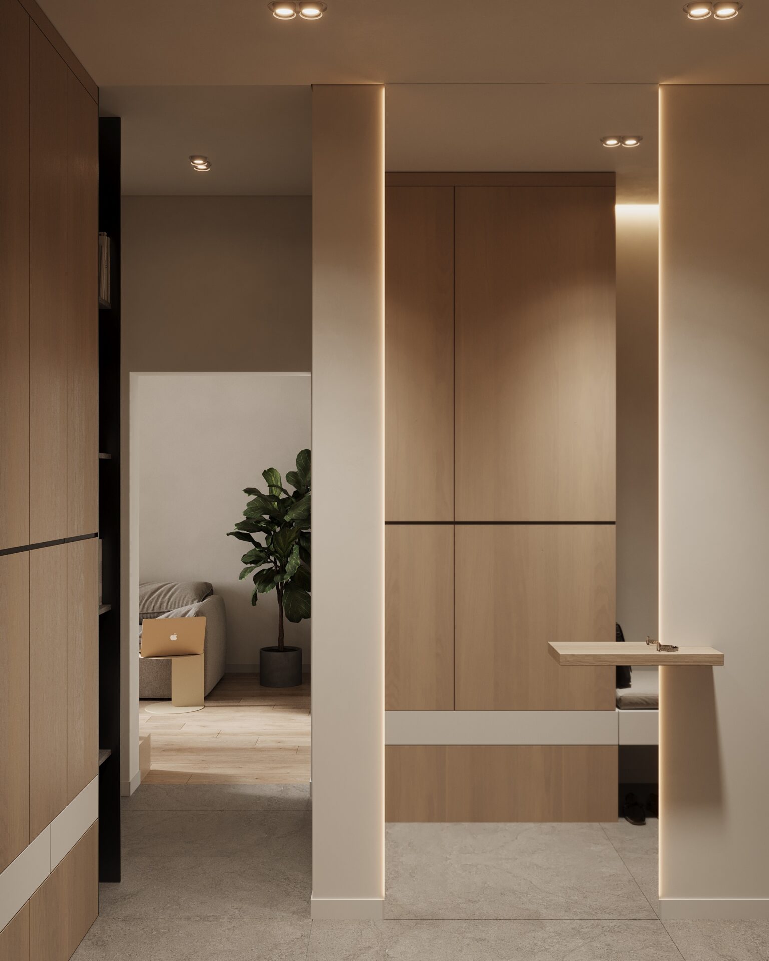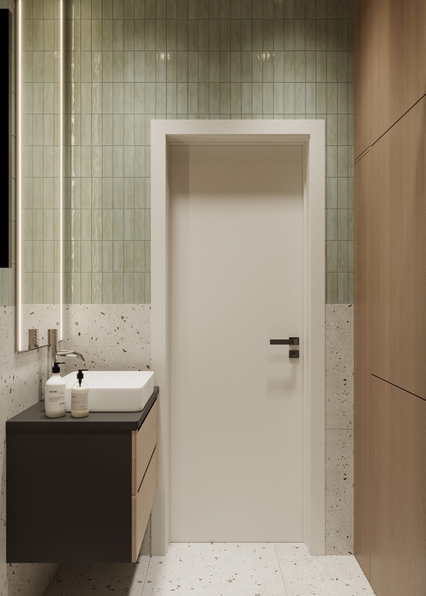 Квартира у сучасному мінімалістичному стилі. У світлих тонах, з використанням теплих природних відтінків та акцентів зеленого кольору. Традиційно для об’єктів малої площі ми передбачили велику кількість вбудованих меблів, які візуально не загромаджують простір, але забезпечують необхідну функціональність житла.