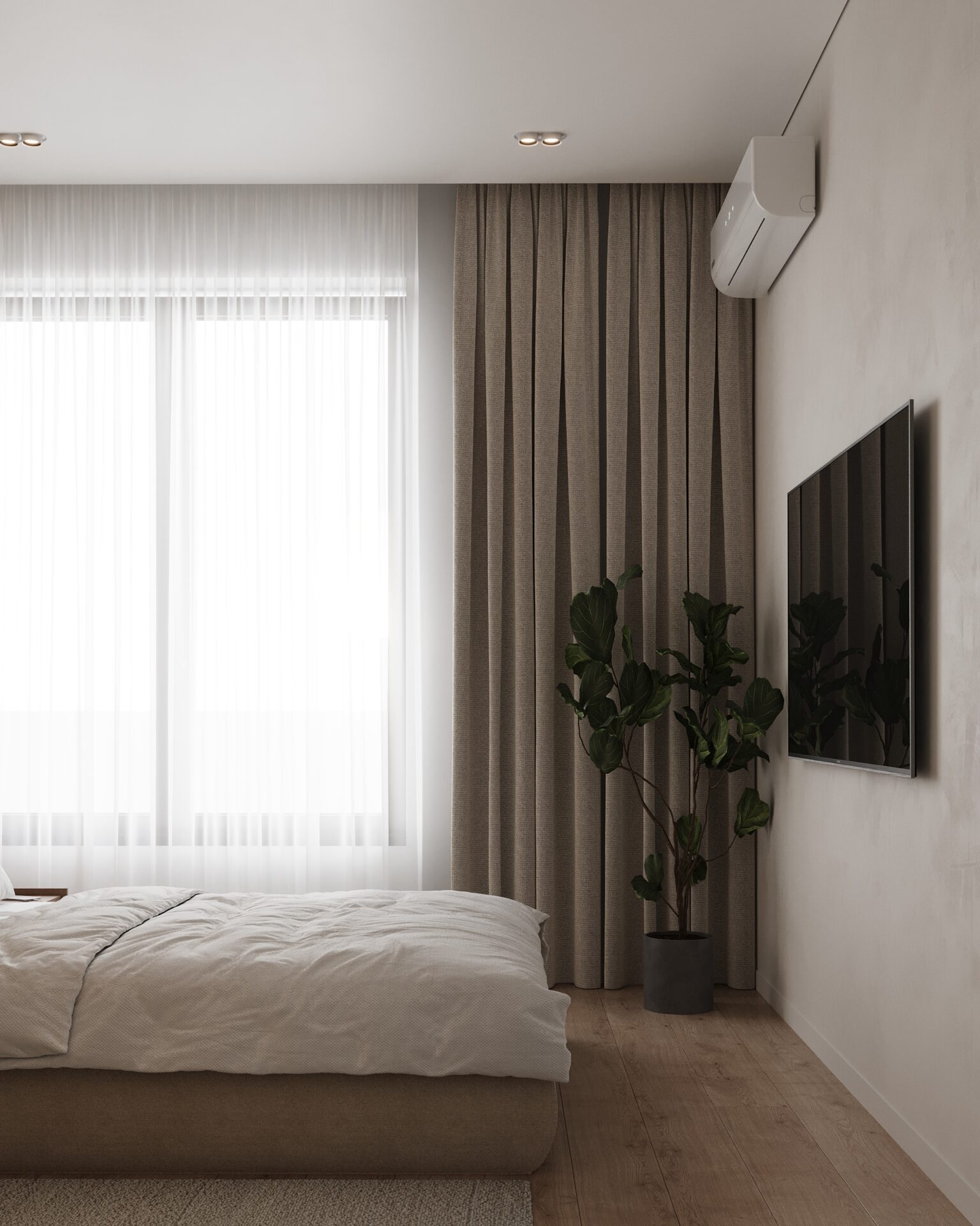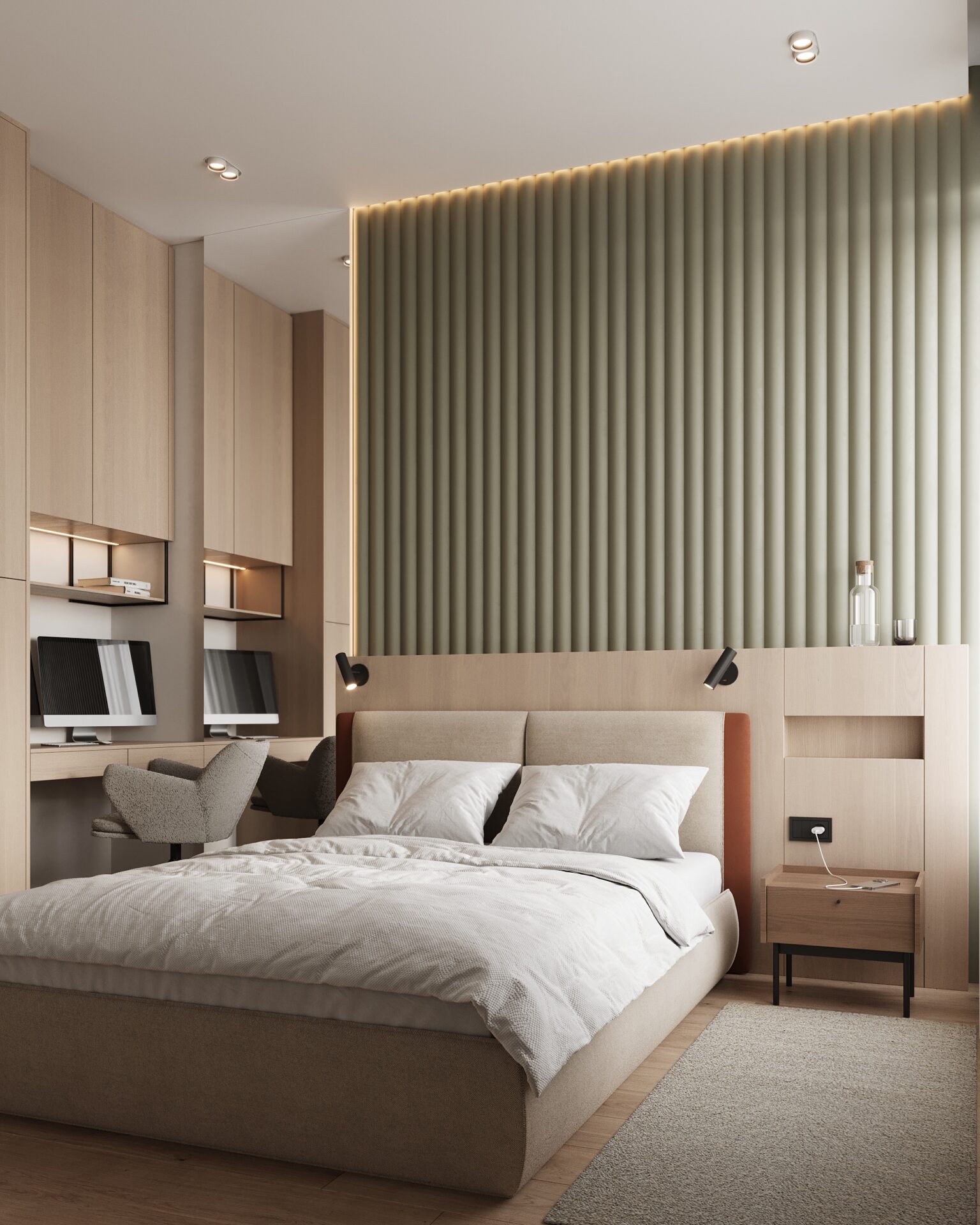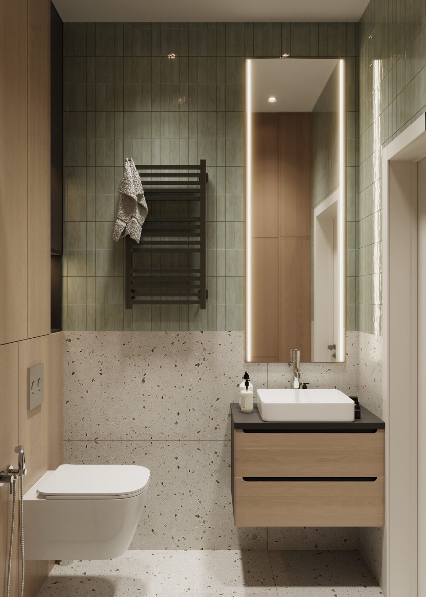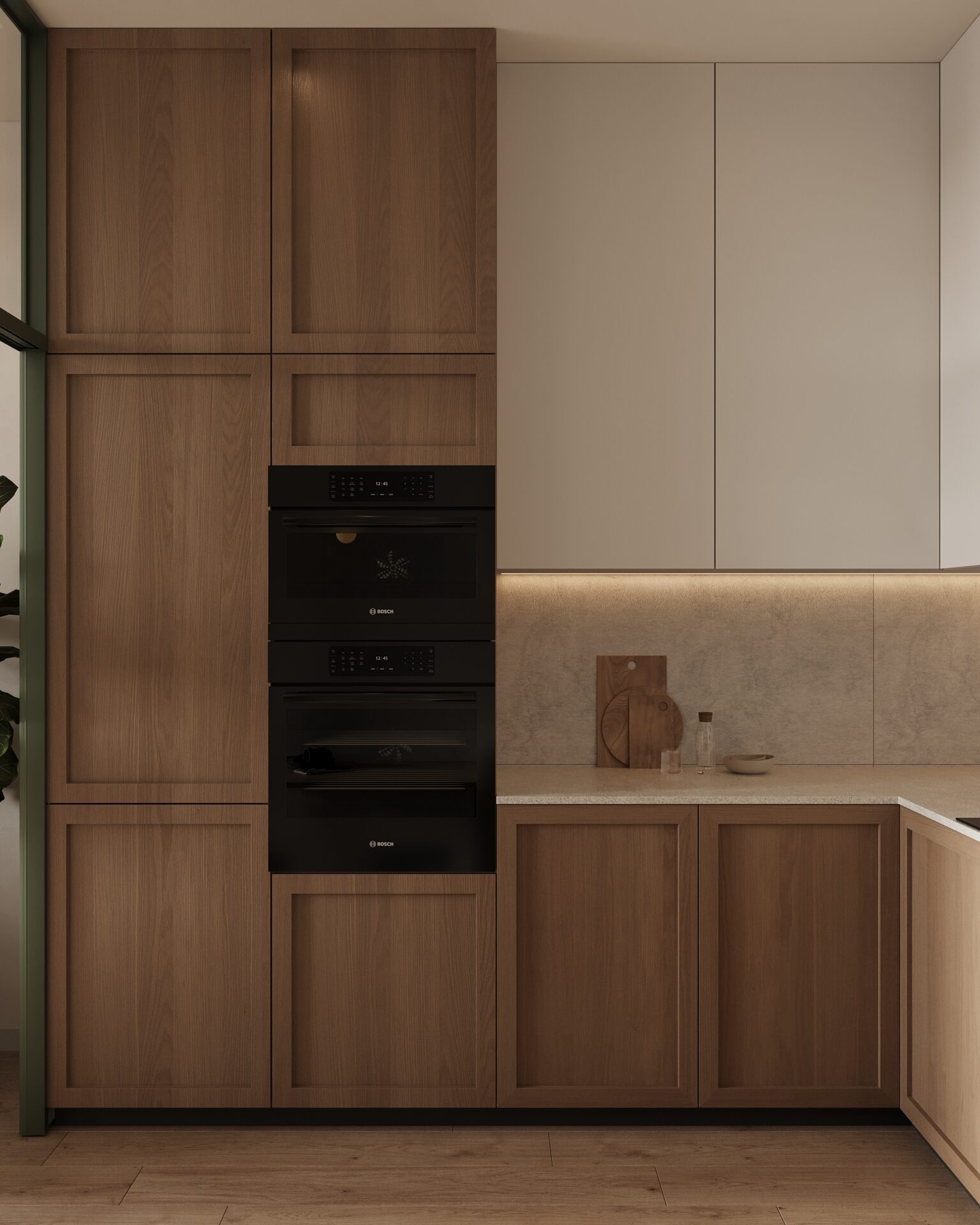 Квартира у сучасному мінімалістичному стилі. У світлих тонах, з використанням теплих природних відтінків та акцентів зеленого кольору. Традиційно для об’єктів малої площі ми передбачили велику кількість вбудованих меблів, які візуально не загромаджують простір, але забезпечують необхідну функціональність житла.