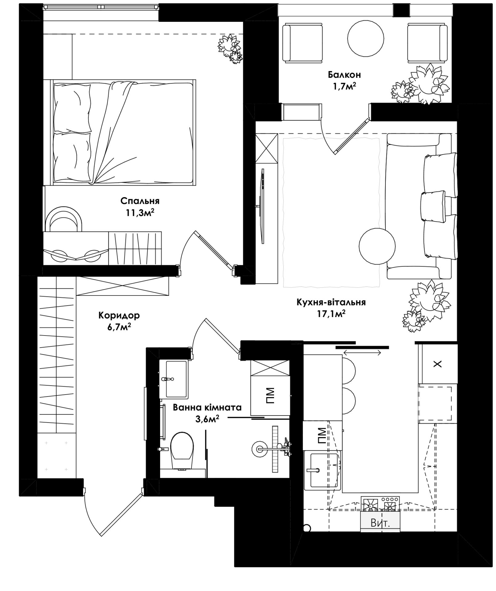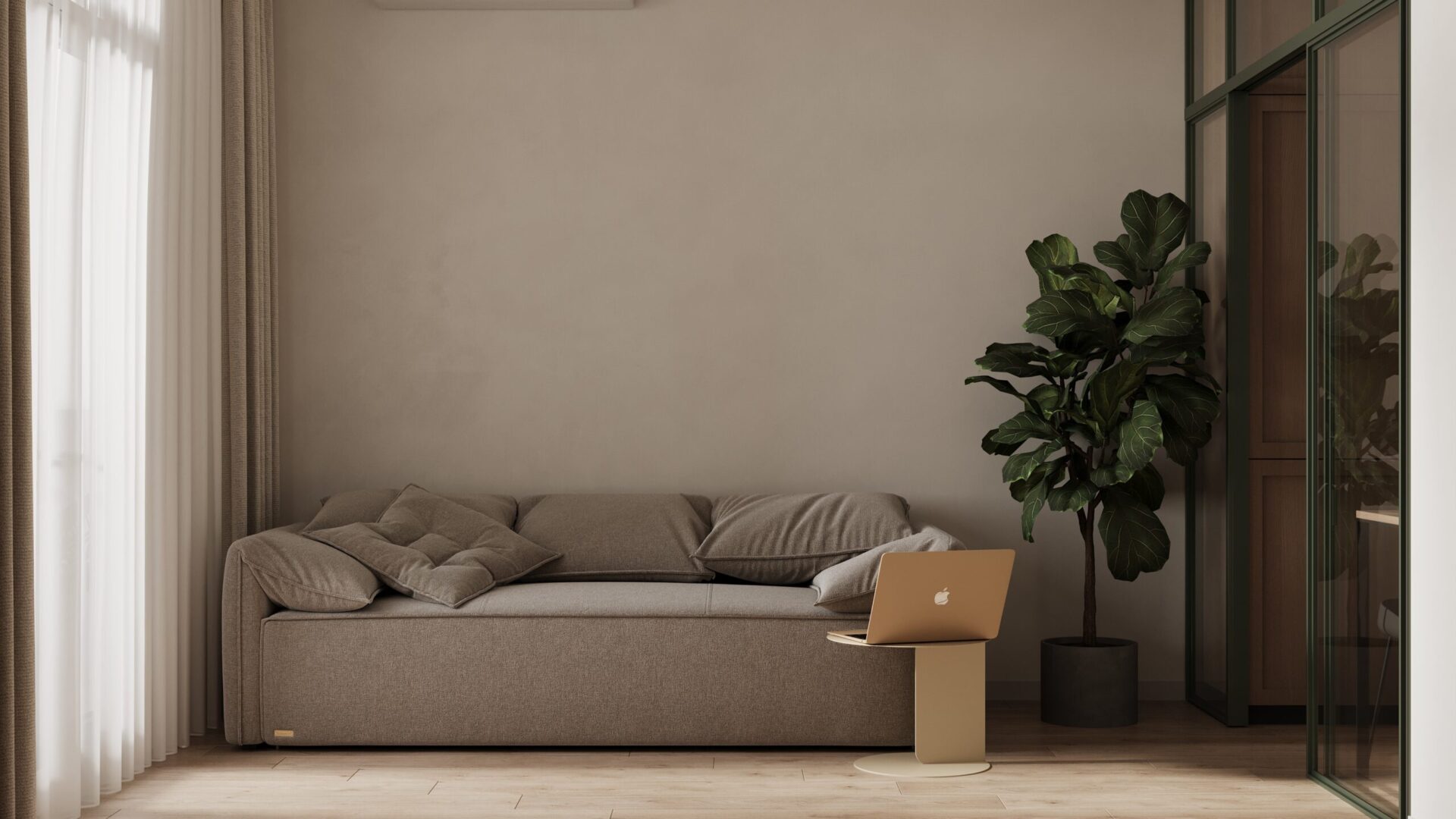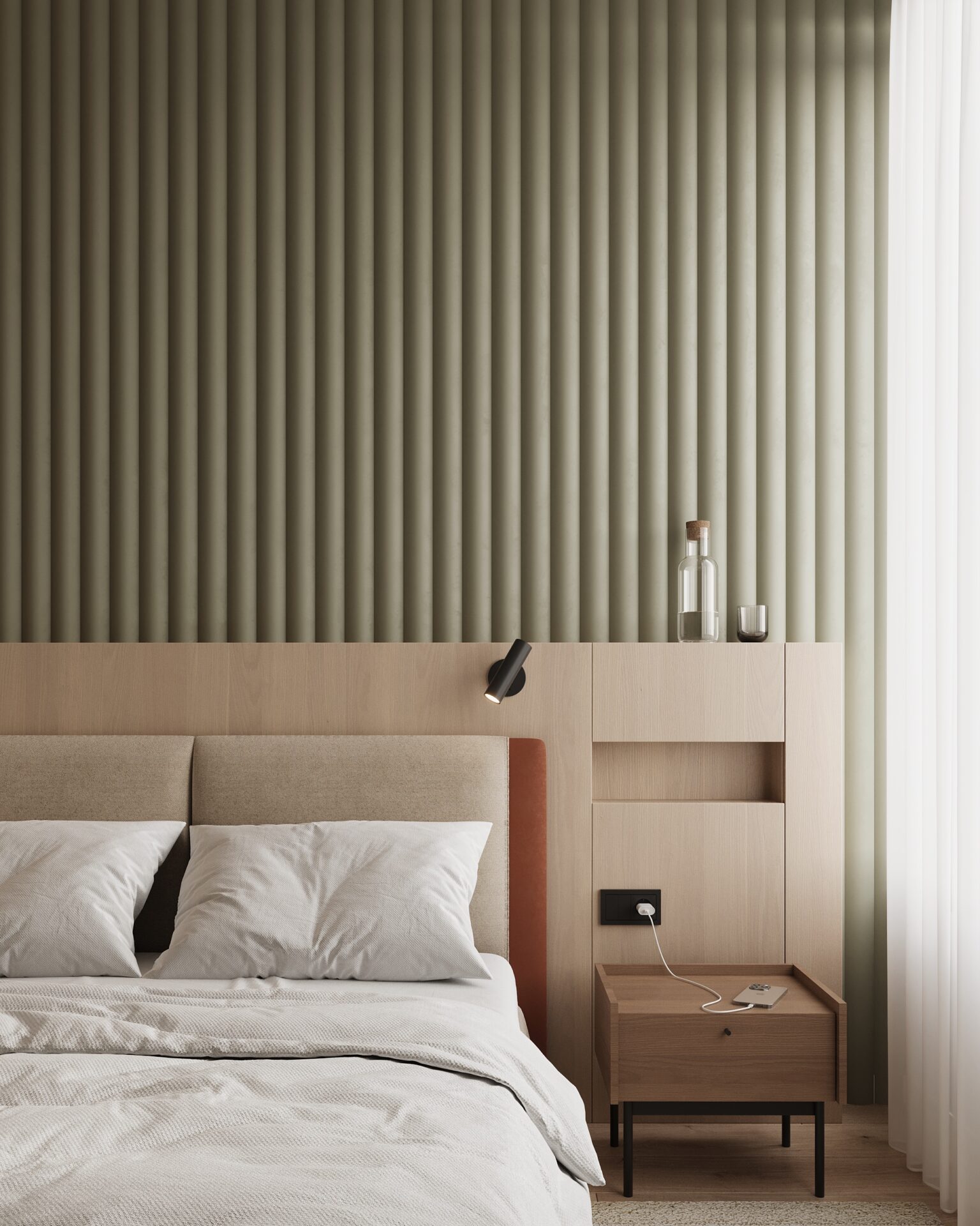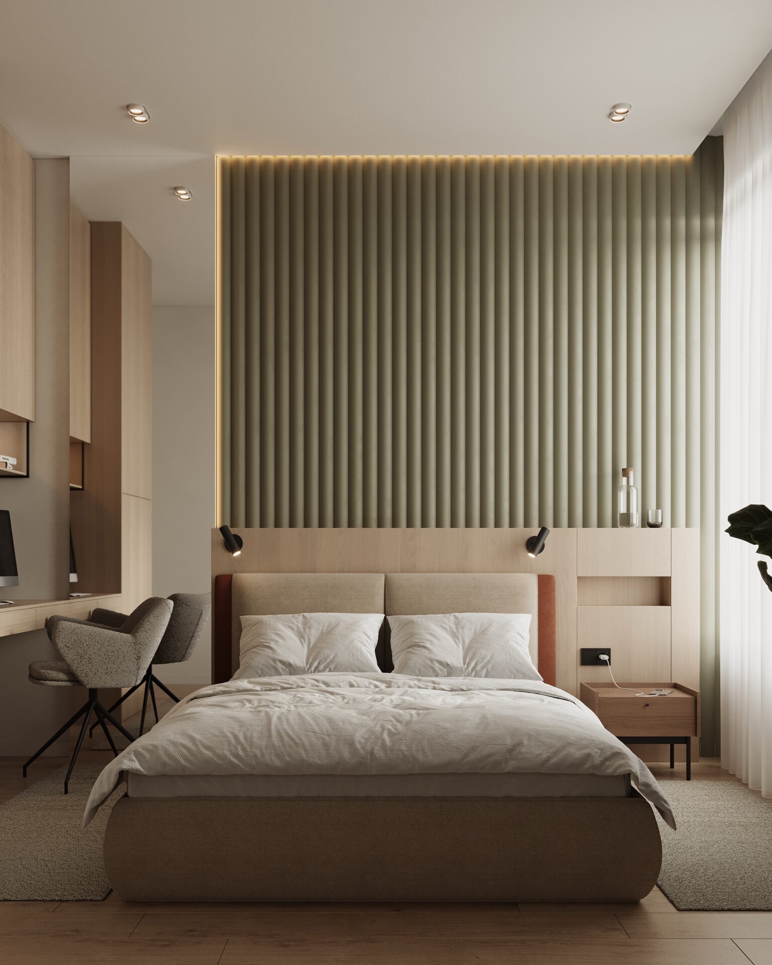 Квартира у сучасному мінімалістичному стилі. У світлих тонах, з використанням теплих природних відтінків та акцентів зеленого кольору. Традиційно для об’єктів малої площі ми передбачили велику кількість вбудованих меблів, які візуально не загромаджують простір, але забезпечують необхідну функціональність житла.
