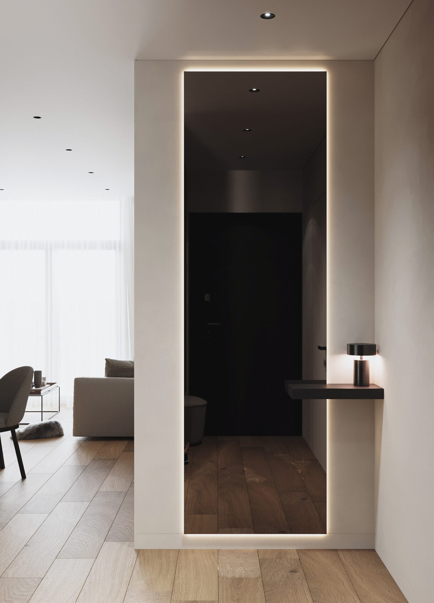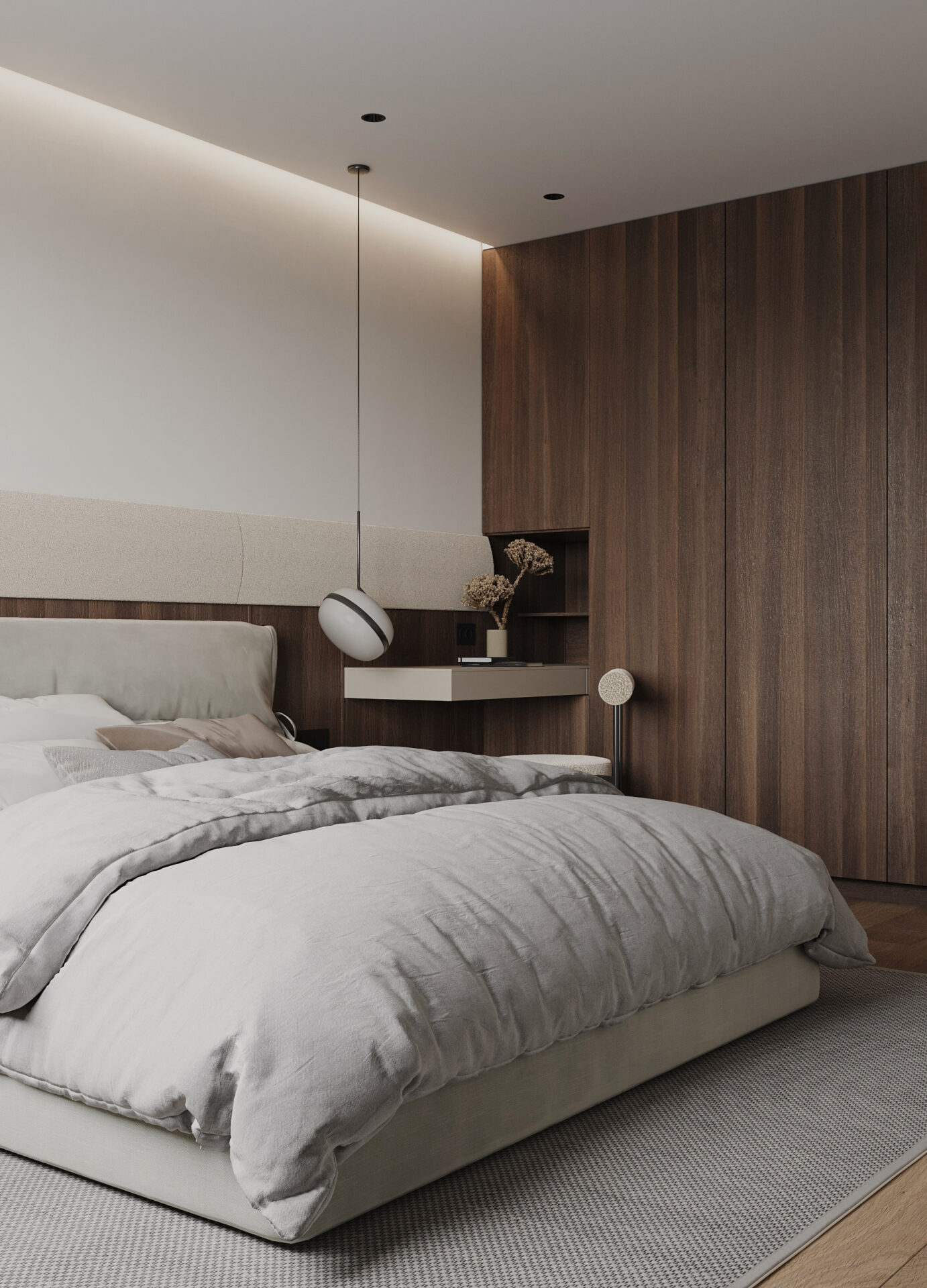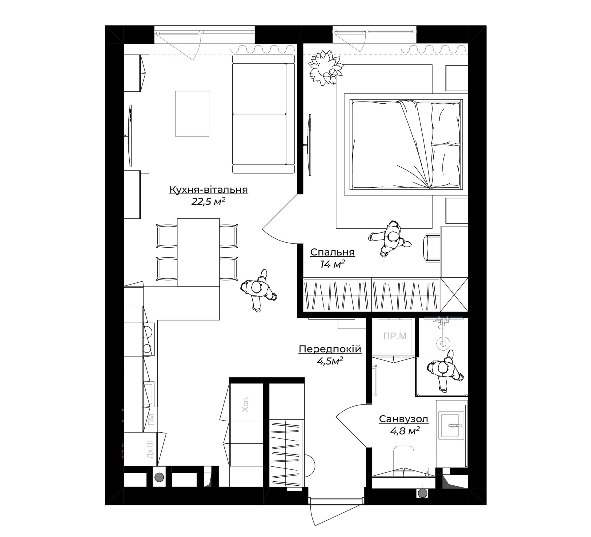 Квартира для оренди в сучасному стилі у стриманих тонах. Сплановані всі необхідні функціональні зони: кухня-їдальня, вітальня з диваном і ТВ, спальня з окремим робочим місцем та санвузол. Забезпечено багато місць для зберігання, зокрема, великі шафи в коридорі та спальні, а також просторі кухонні меблі для різного приладдя і бакалії.