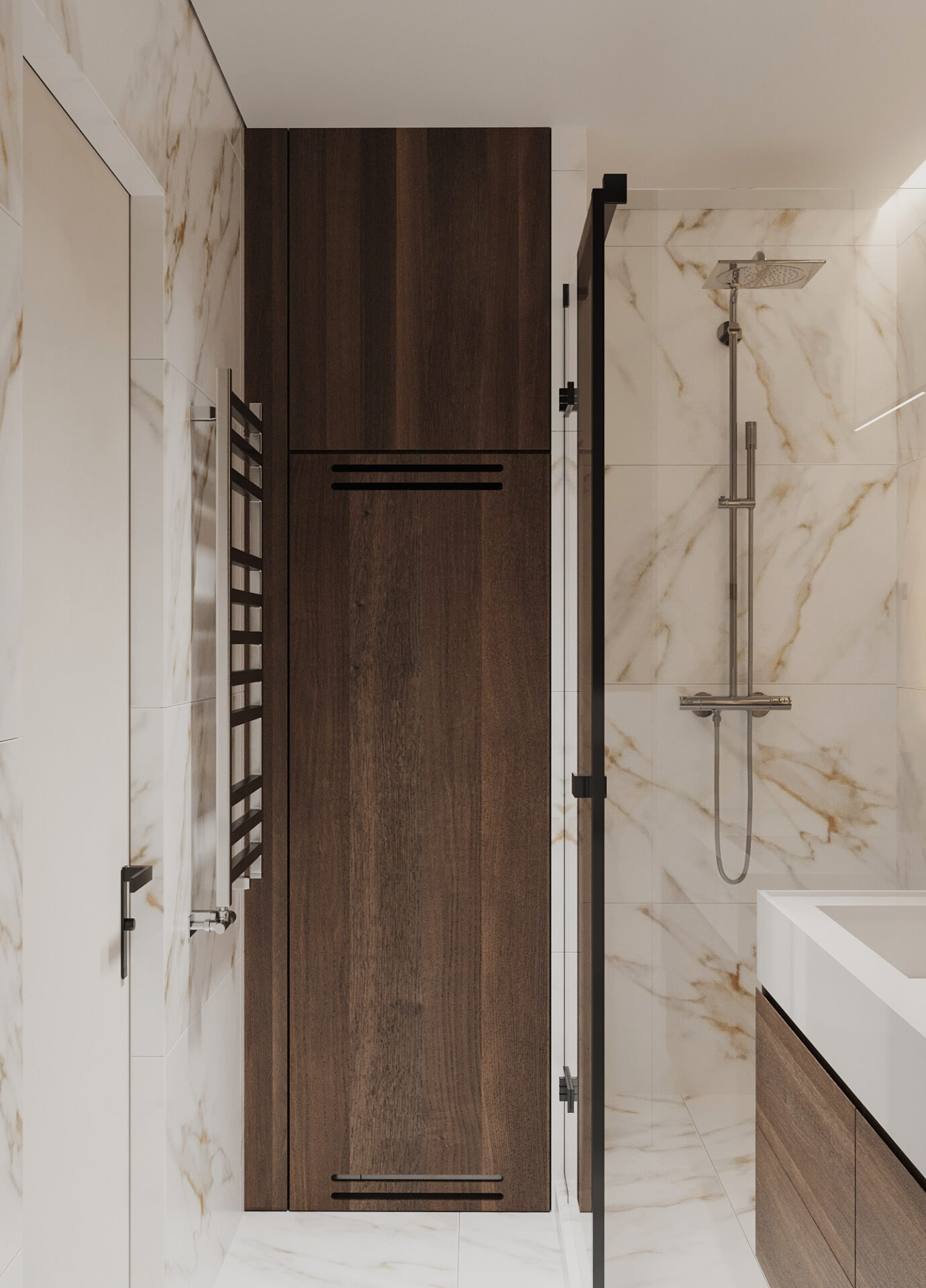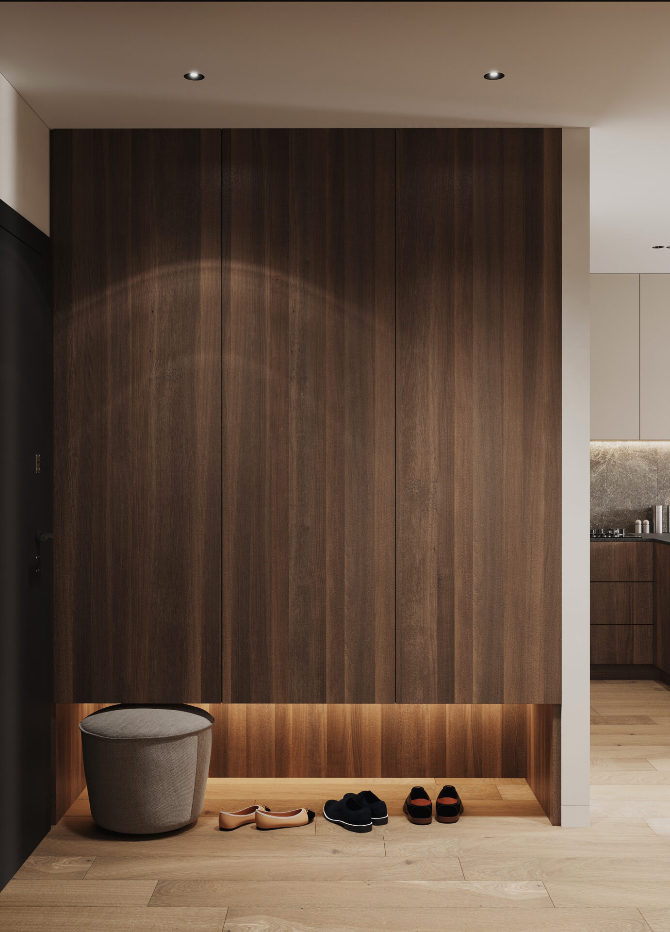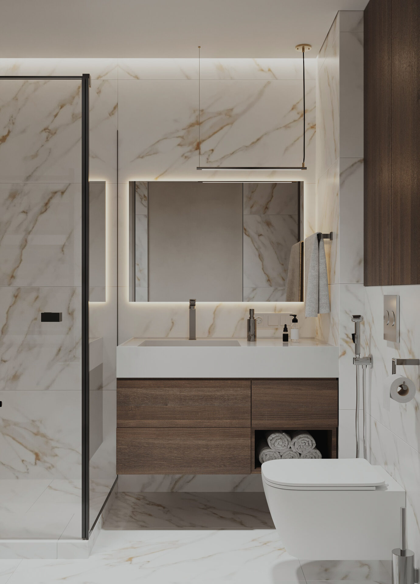 Квартира для оренди в сучасному стилі у стриманих тонах. Сплановані всі необхідні функціональні зони: кухня-їдальня, вітальня з диваном і ТВ, спальня з окремим робочим місцем та санвузол. Забезпечено багато місць для зберігання, зокрема, великі шафи в коридорі та спальні, а також просторі кухонні меблі для різного приладдя і бакалії.
