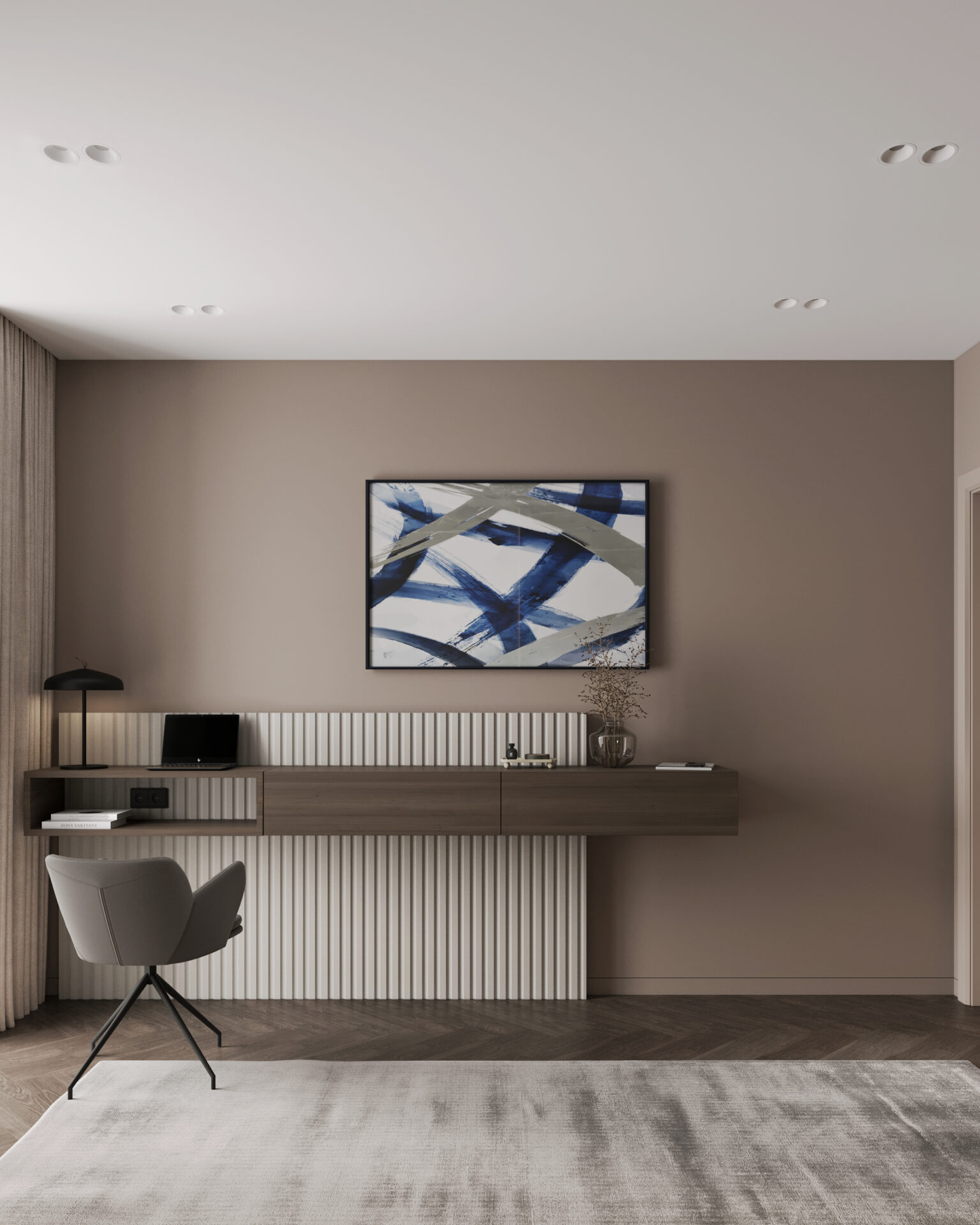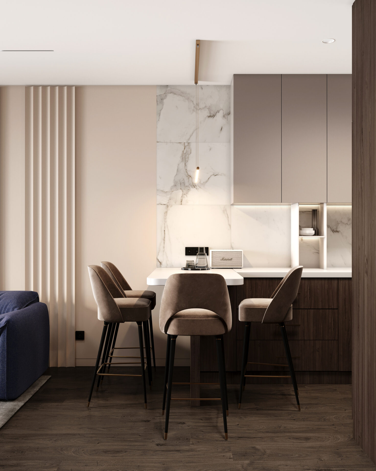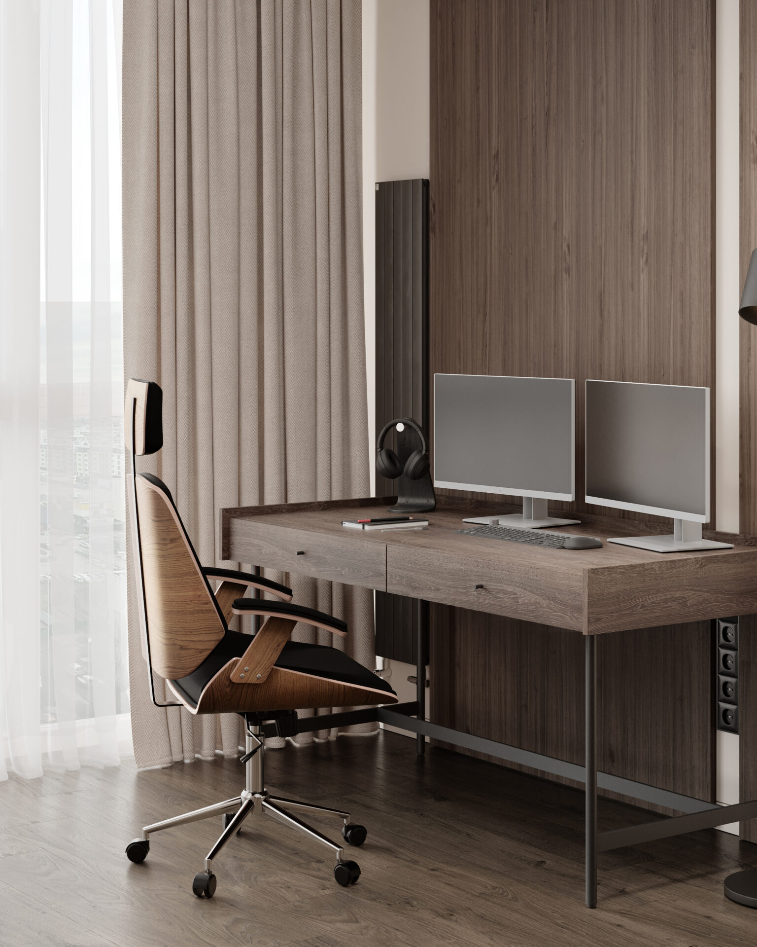Типова функціональна однокімнатна квартира з акцентом на можливості працювати з дому, про що свідчать дві окремі робочі зони у кухні-вітальні та спальні. Традиційно для невеликих площ тут передбачено багато місць для зберігання, а також багатофункціональні рішення, такі як розкладний диван, або консоль-трансформер.