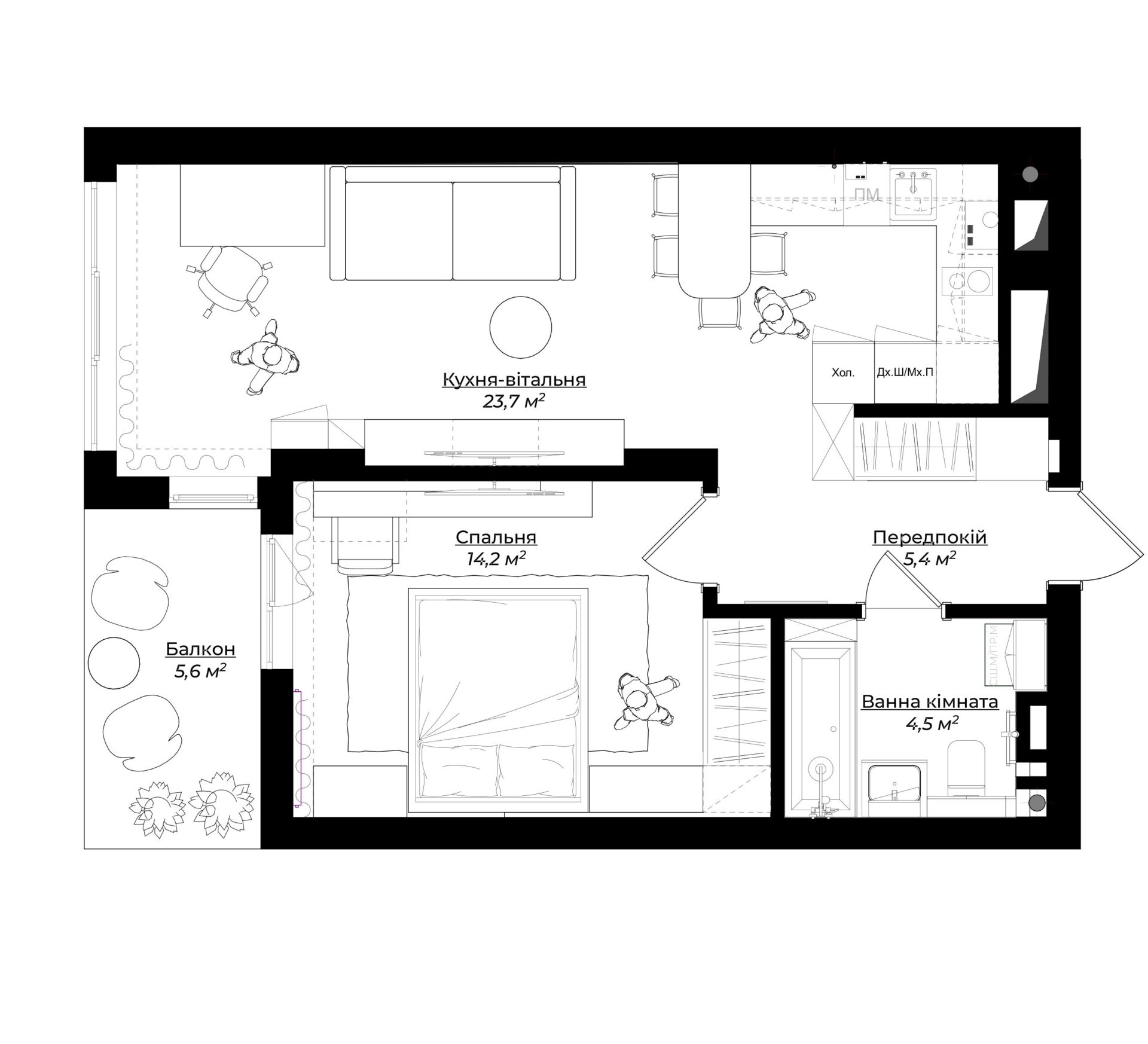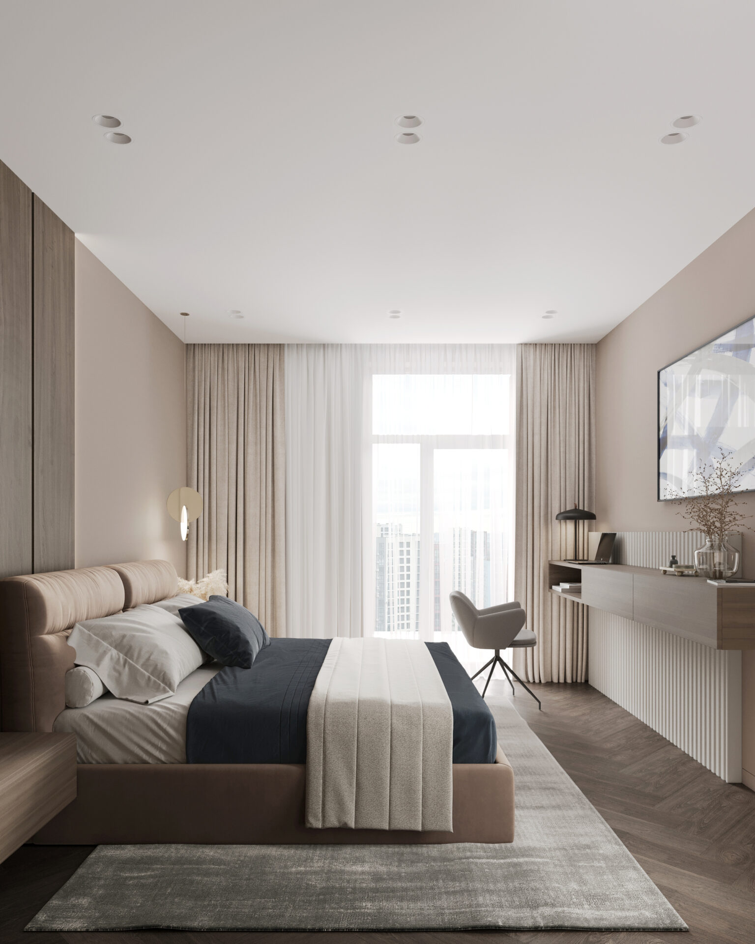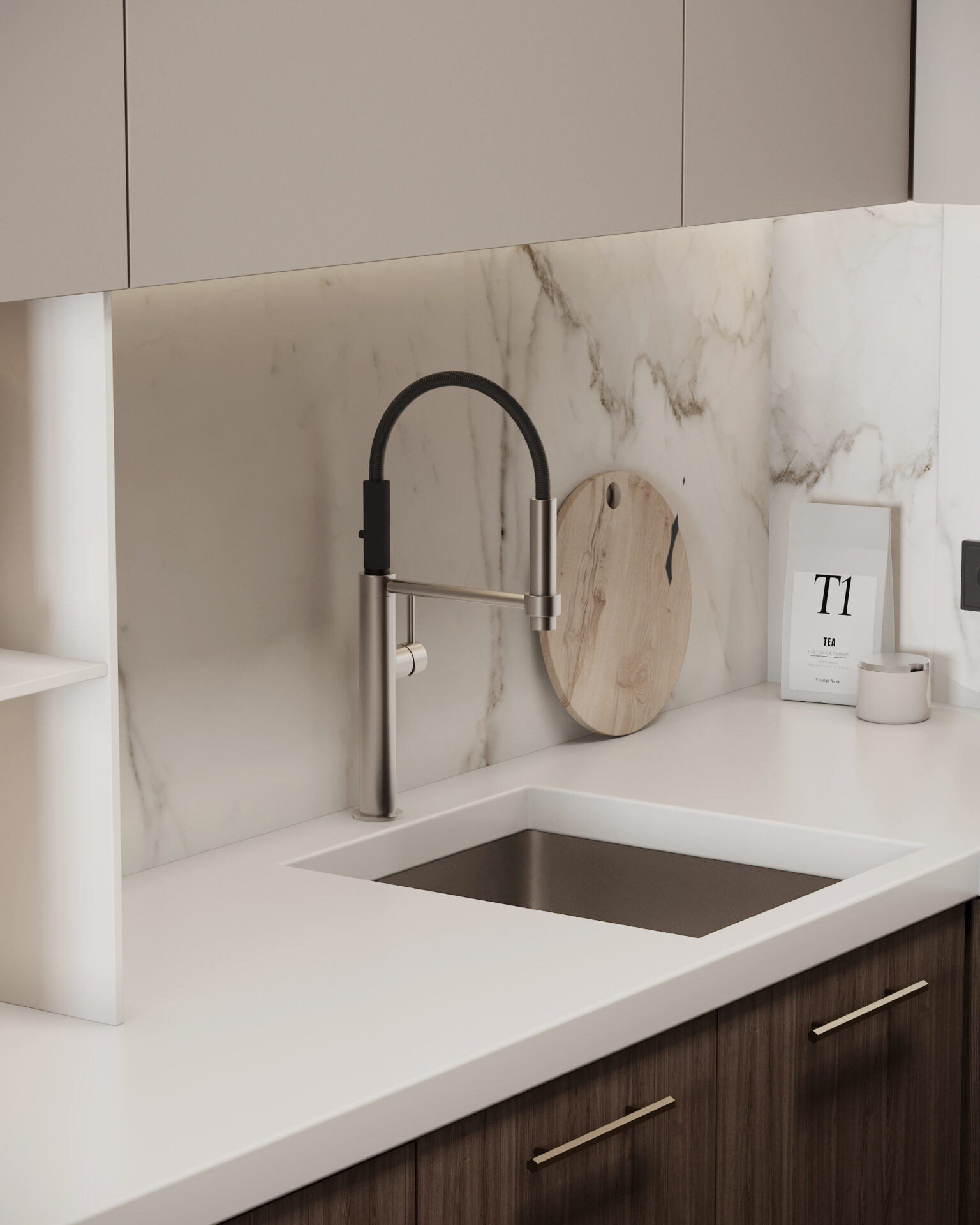 Типова функціональна однокімнатна квартира з акцентом на можливості працювати з дому, про що свідчать дві окремі робочі зони у кухні-вітальні та спальні. Традиційно для невеликих площ тут передбачено багато місць для зберігання, а також багатофункціональні рішення, такі як розкладний диван, або консоль-трансформер.