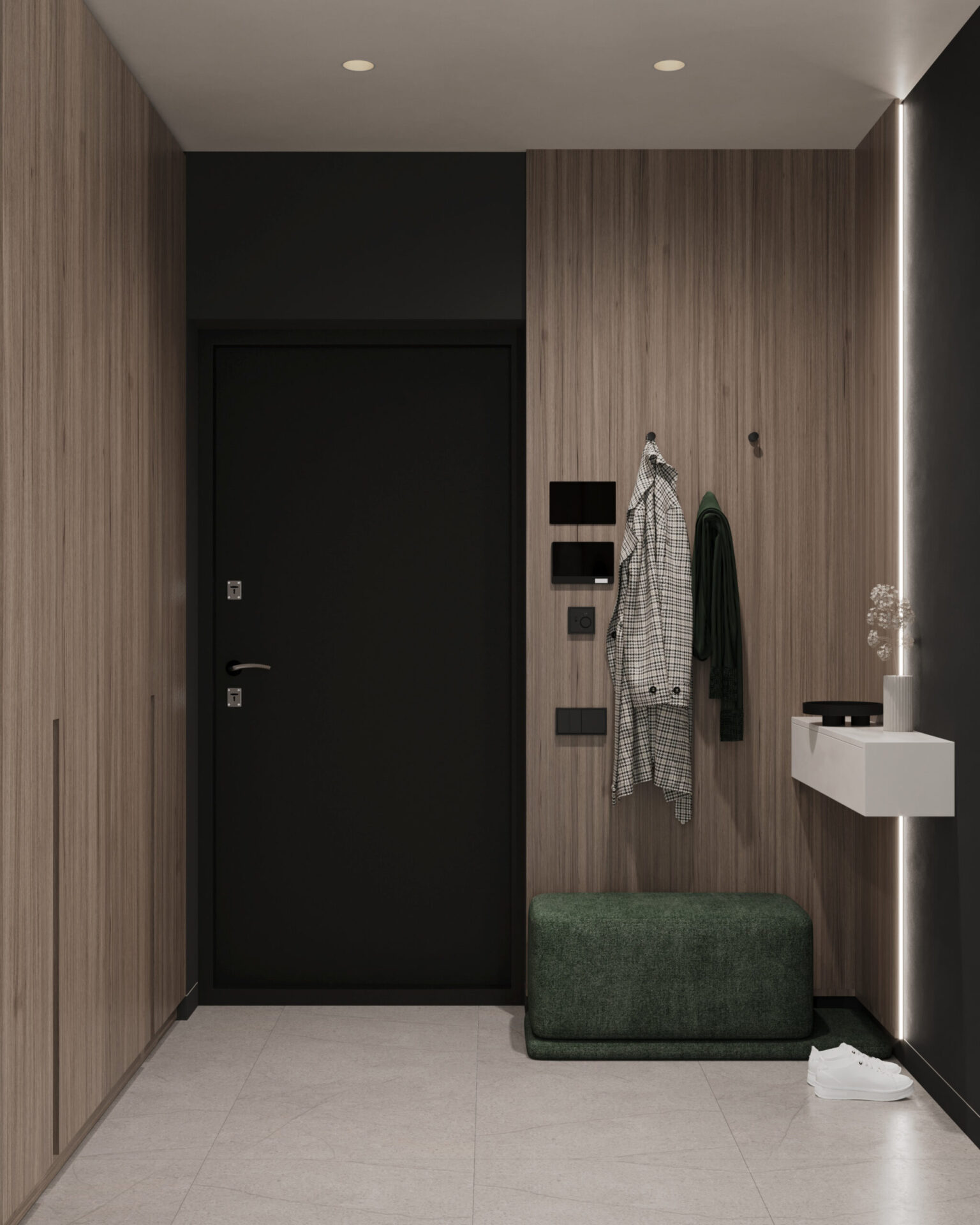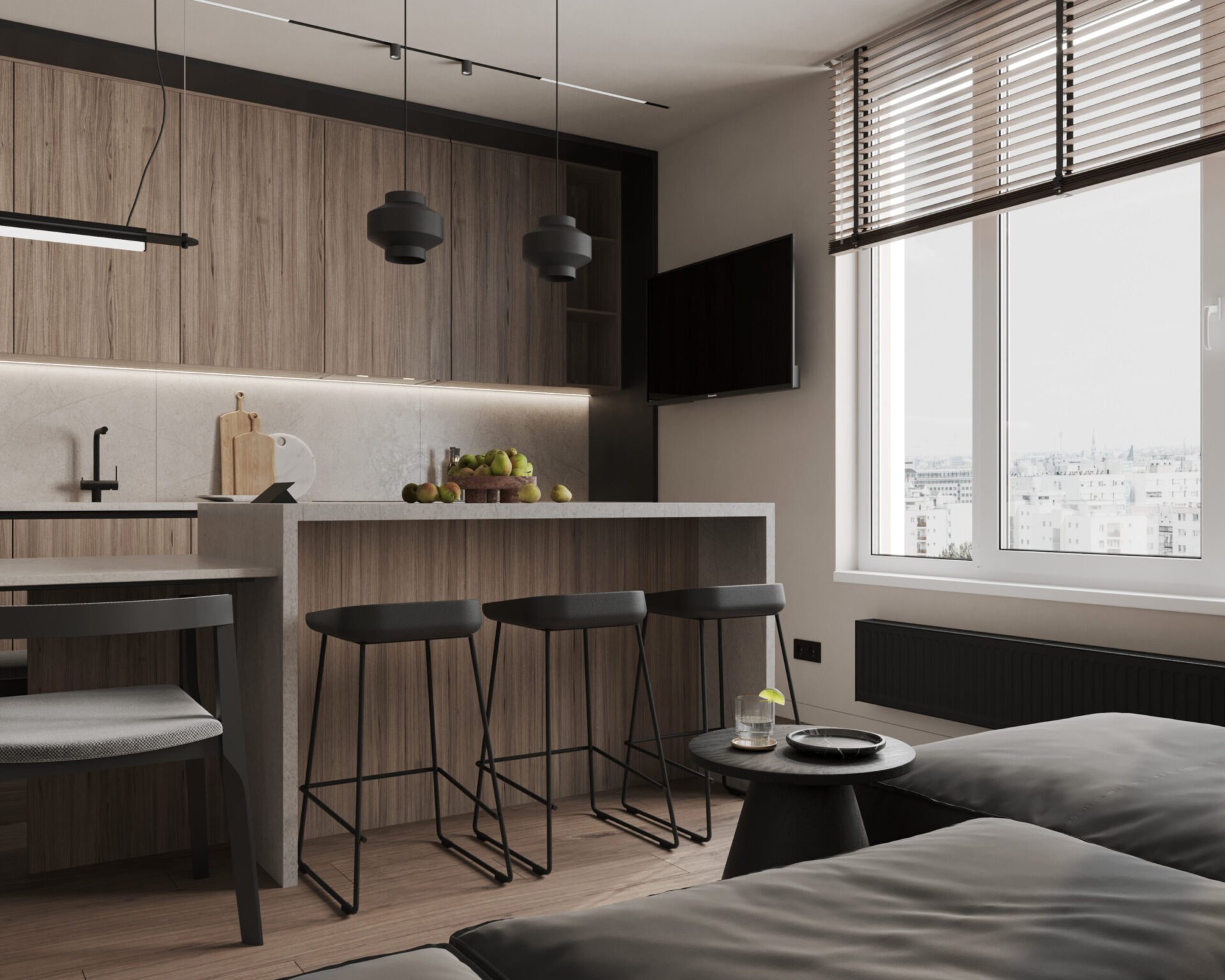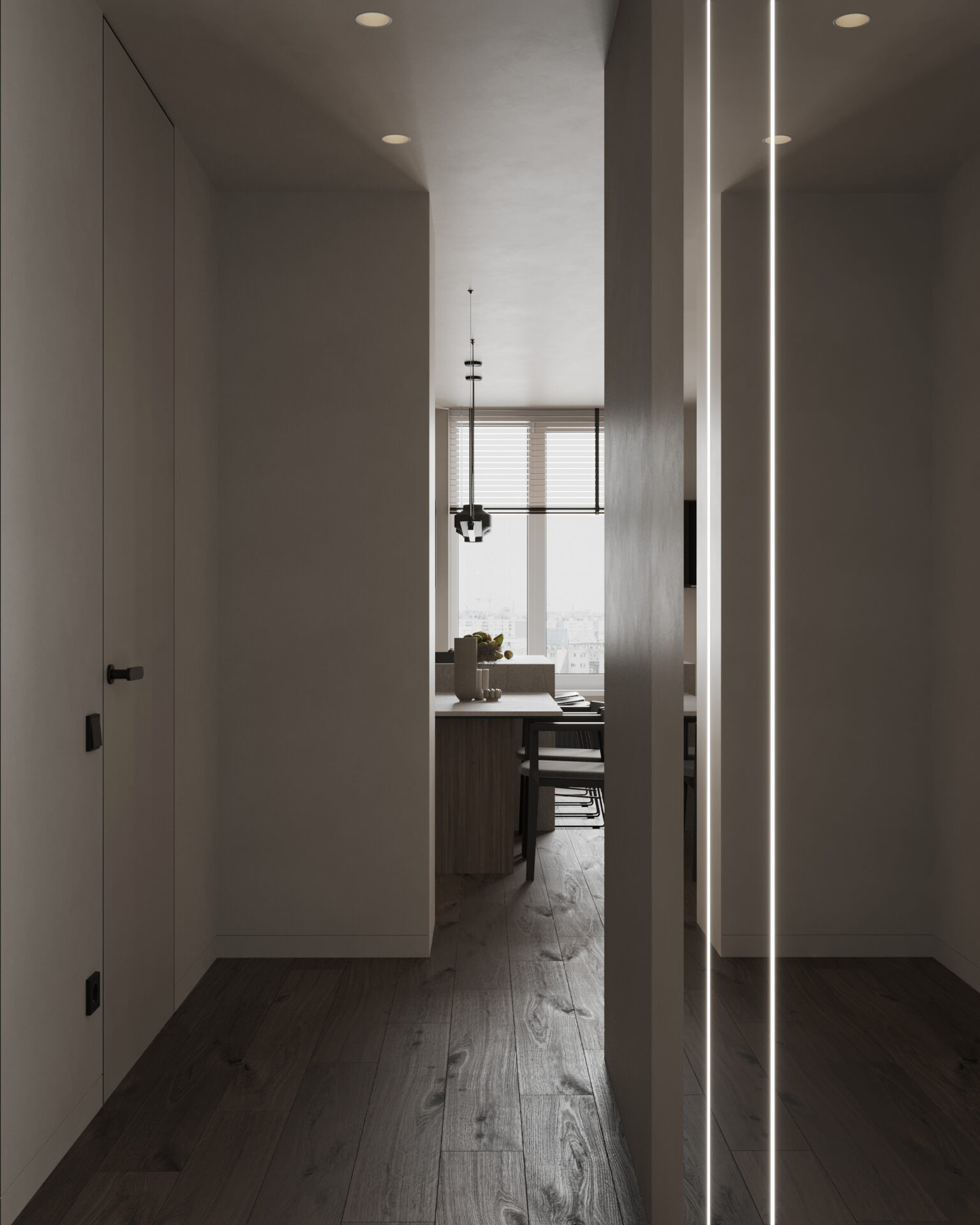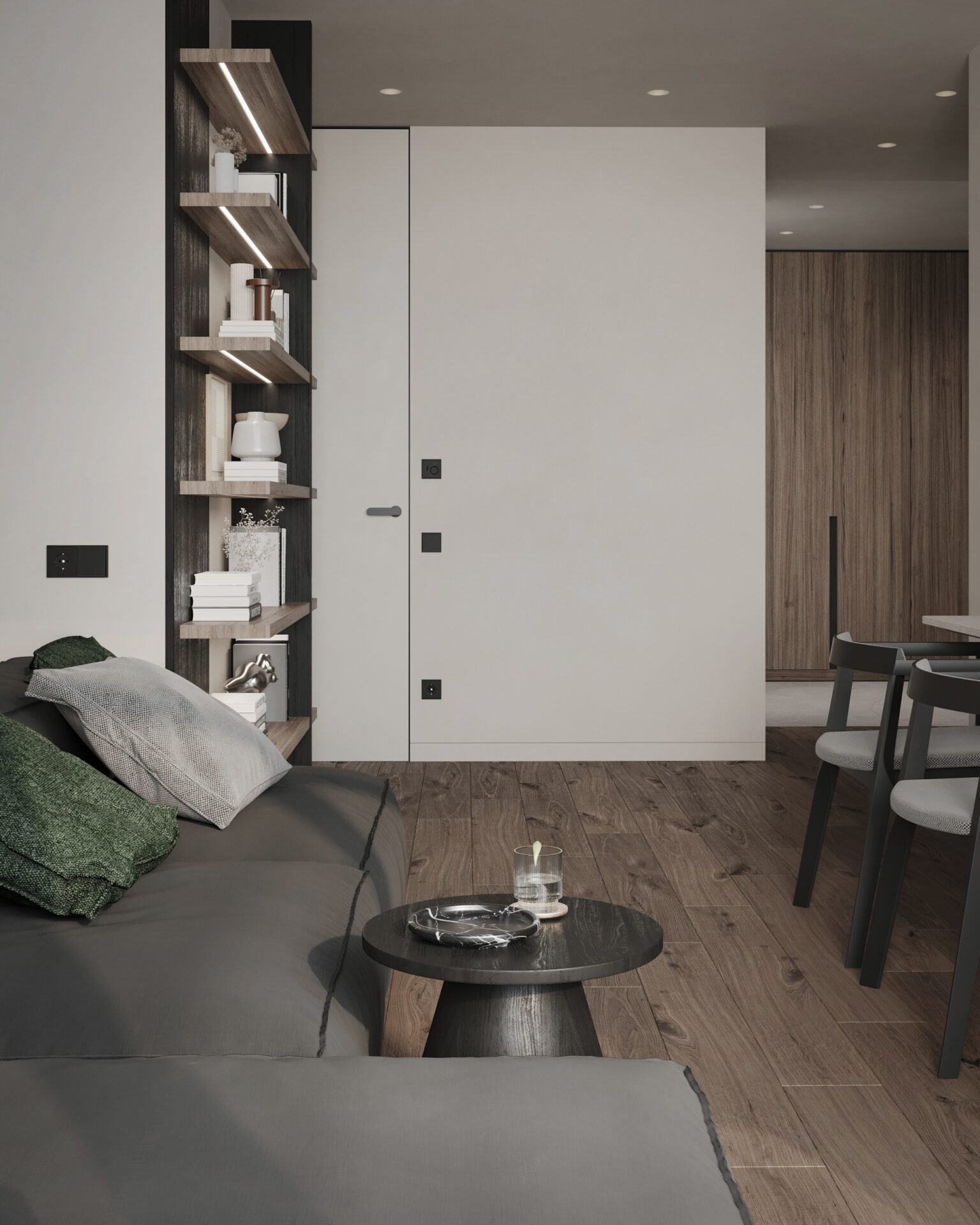 Світла кутова квартира з панорамними вікнами для молодої дівчини. Мінімалістична концепція інтер’єру поєднує світлі тони та контрастні акценти з темного дерева. Однак головною особливістю проєкту є його планування. Технічно, тут передбачені всі необхідні кімнати, але кожна з них виконана доволі цікаво та нестандартно.