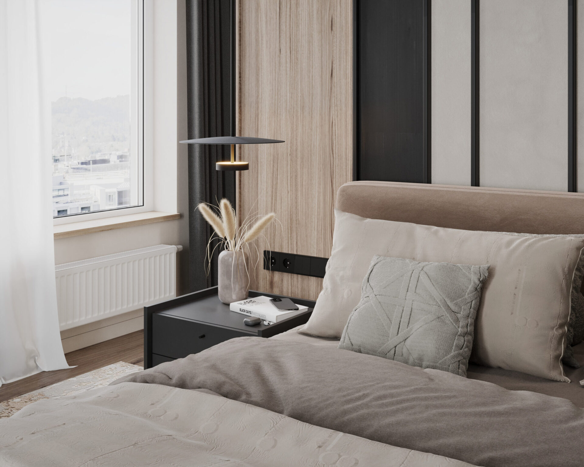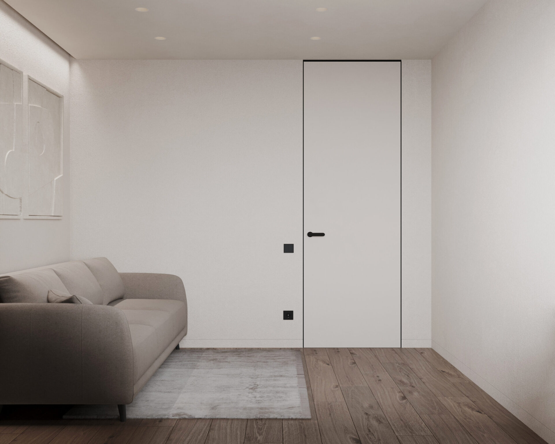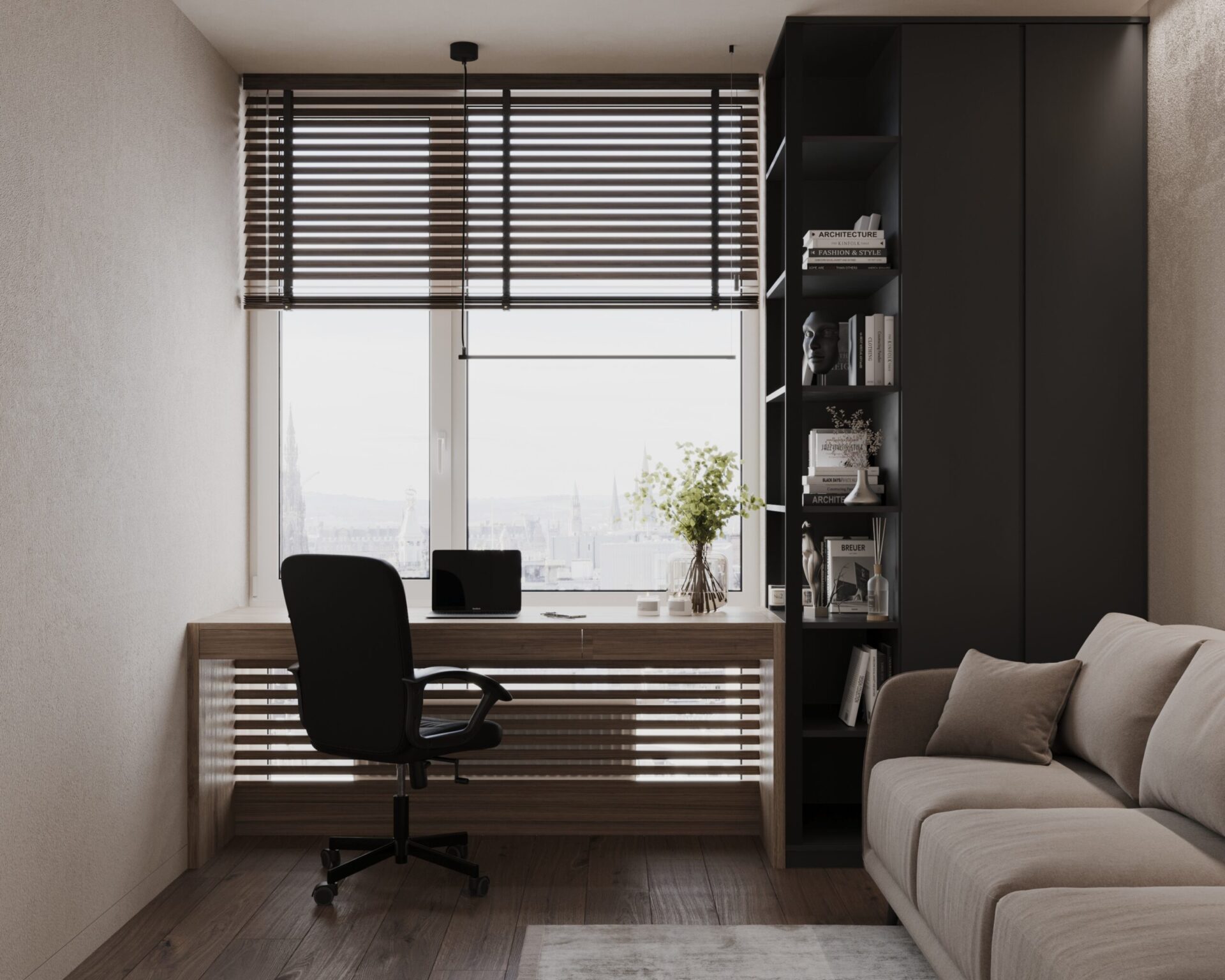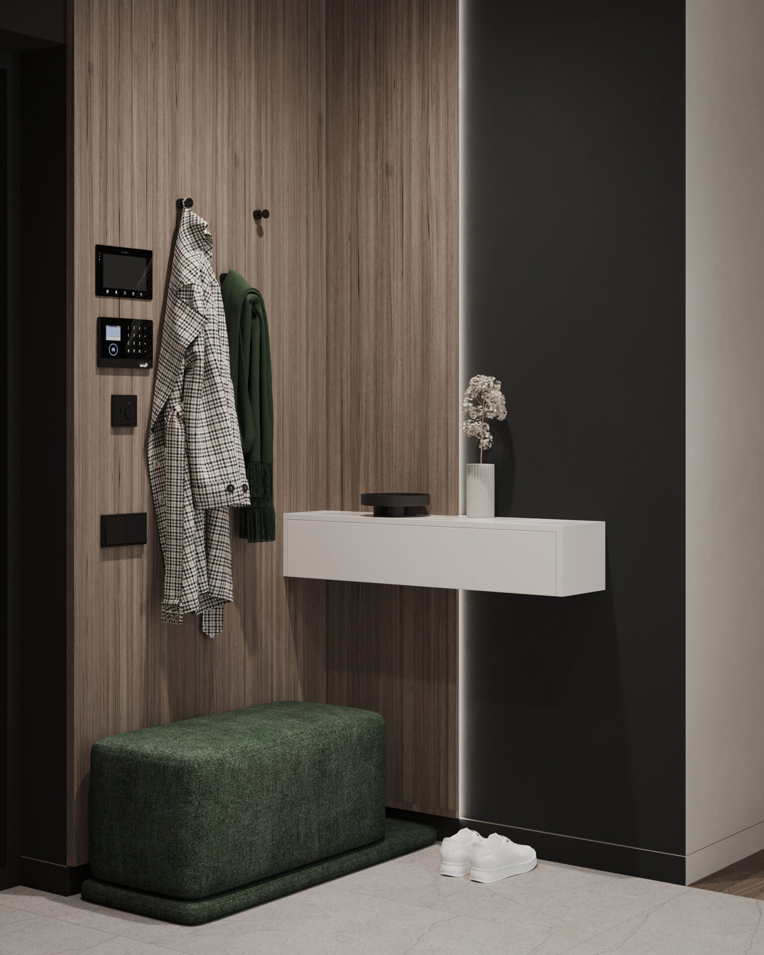 Світла кутова квартира з панорамними вікнами для молодої дівчини. Мінімалістична концепція інтер’єру поєднує світлі тони та контрастні акценти з темного дерева. Однак головною особливістю проєкту є його планування. Технічно, тут передбачені всі необхідні кімнати, але кожна з них виконана доволі цікаво та нестандартно.