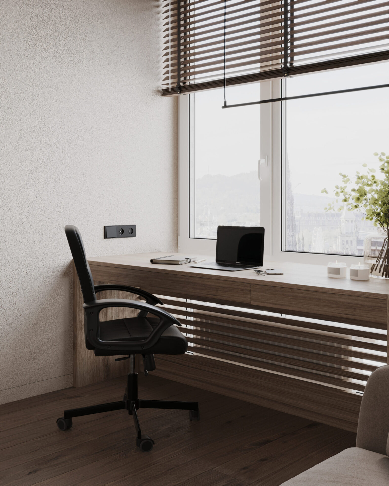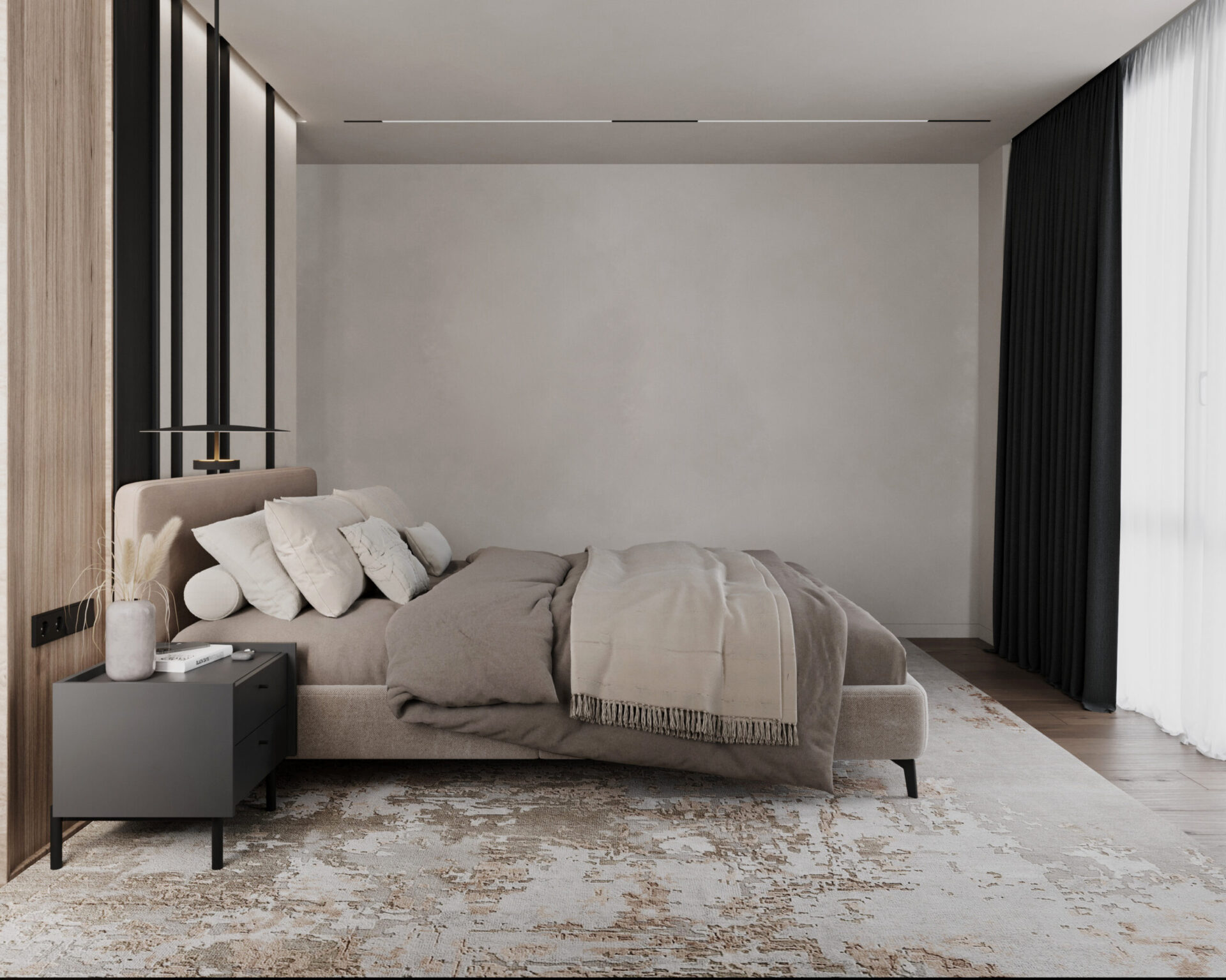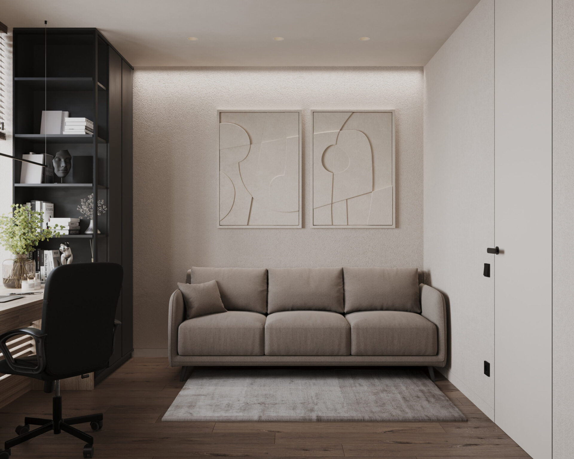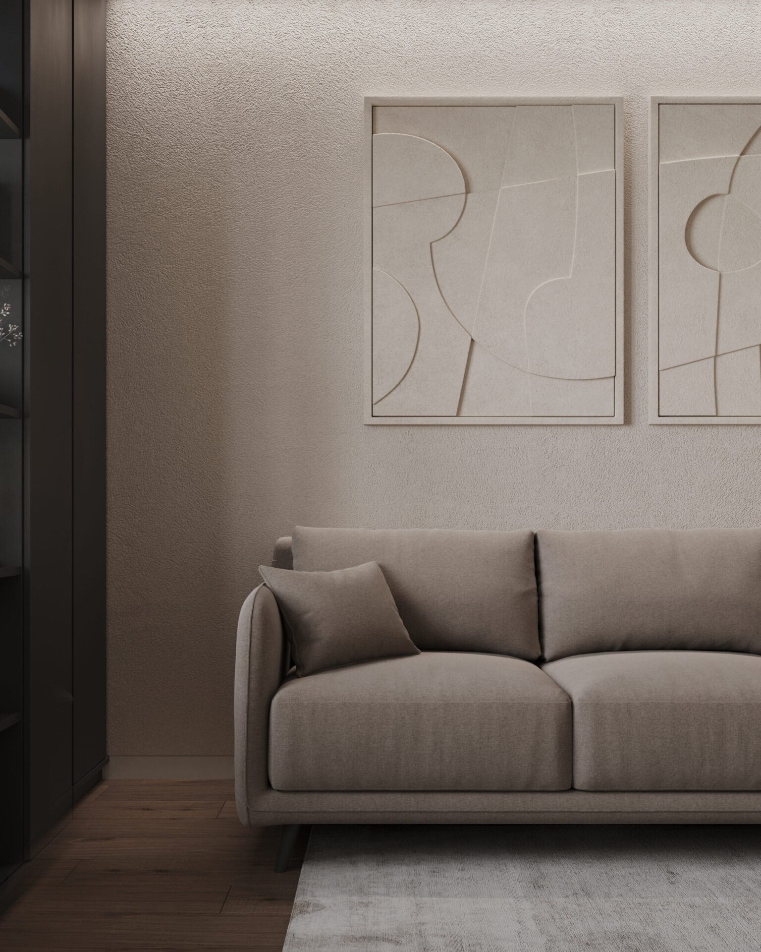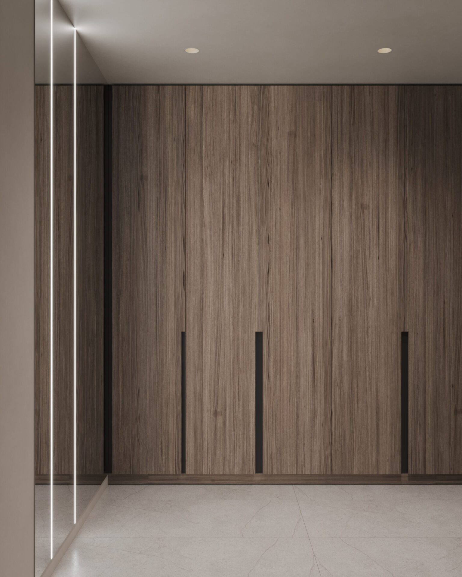 Світла кутова квартира з панорамними вікнами для молодої дівчини. Мінімалістична концепція інтер’єру поєднує світлі тони та контрастні акценти з темного дерева. Однак головною особливістю проєкту є його планування. Технічно, тут передбачені всі необхідні кімнати, але кожна з них виконана доволі цікаво та нестандартно.
