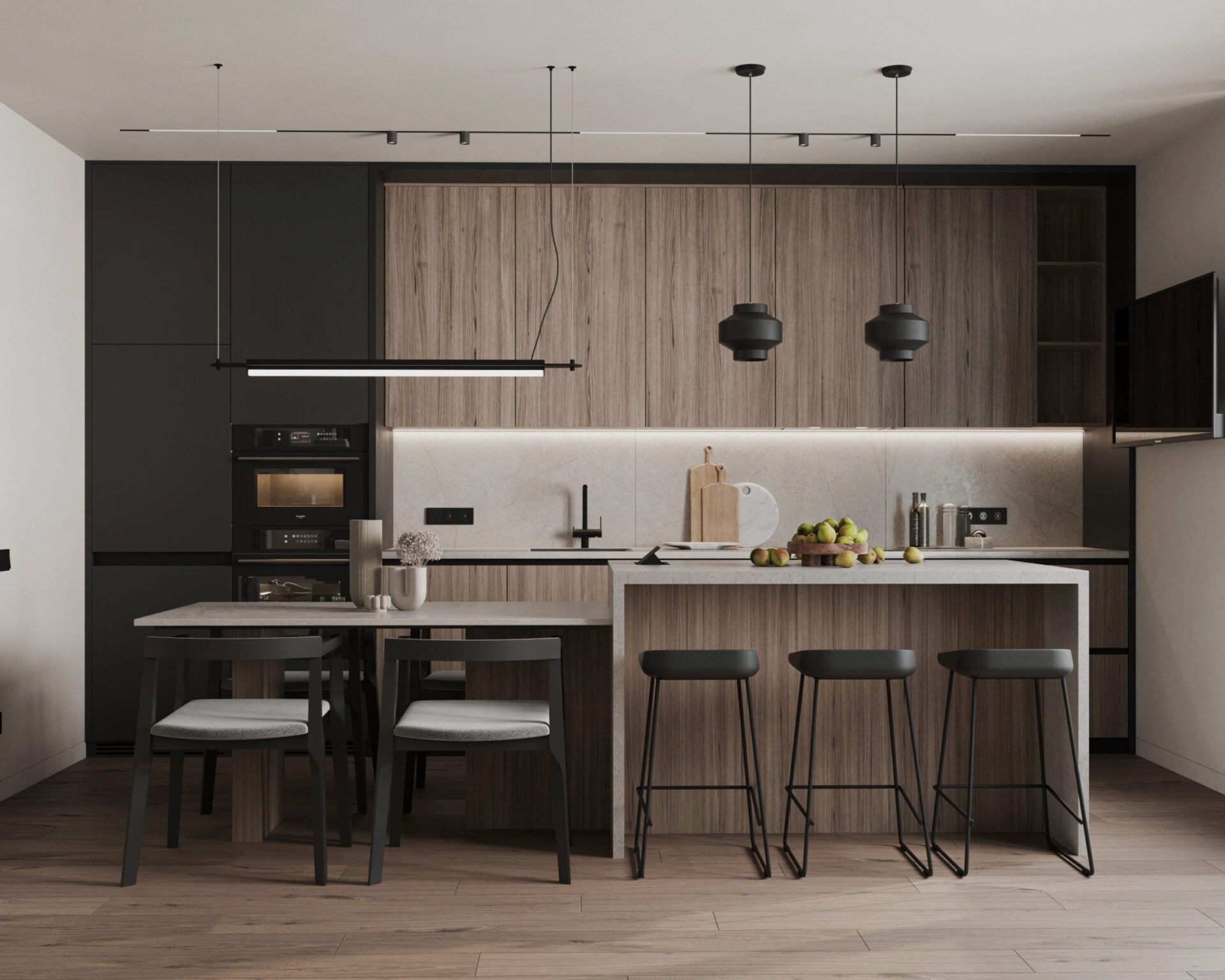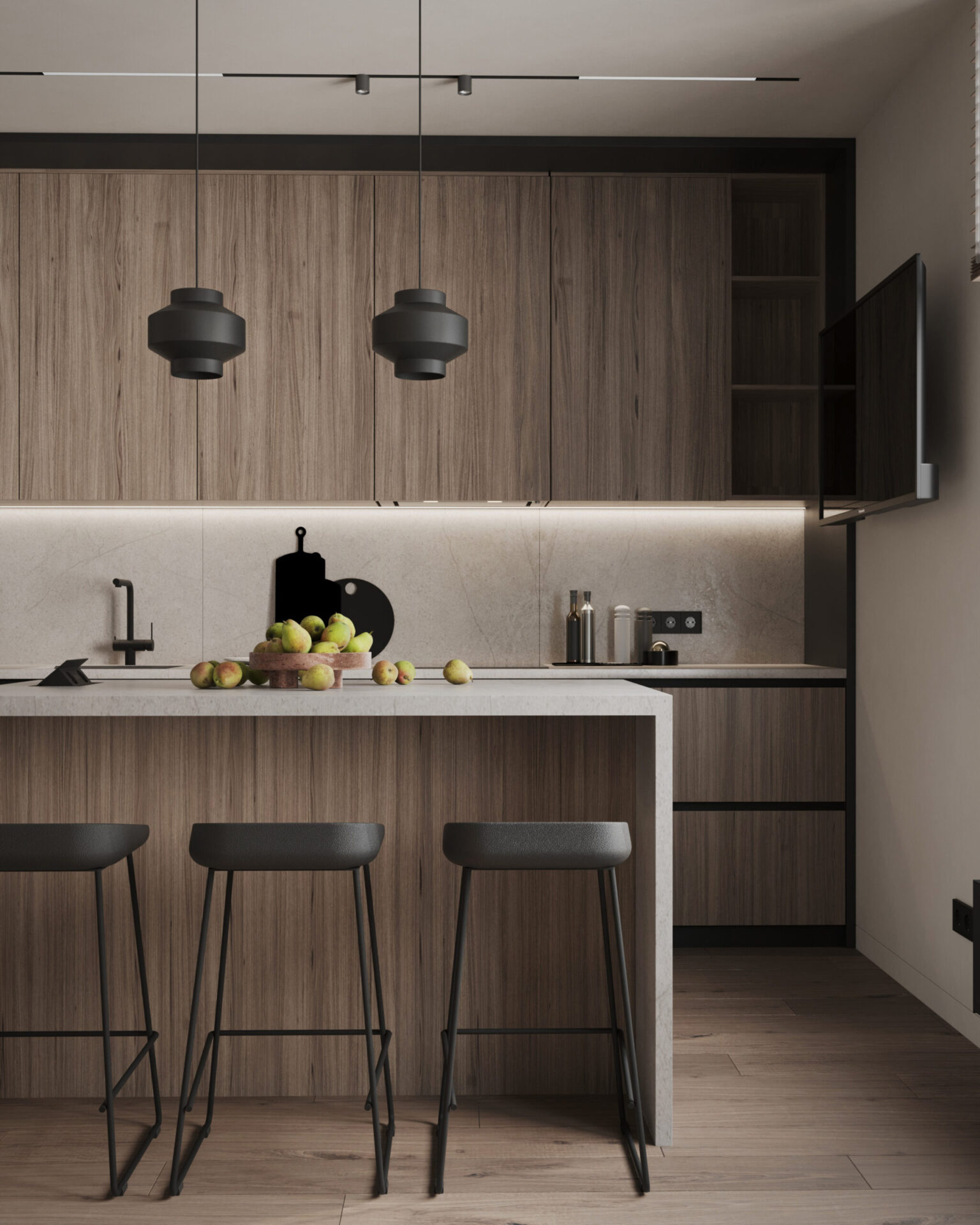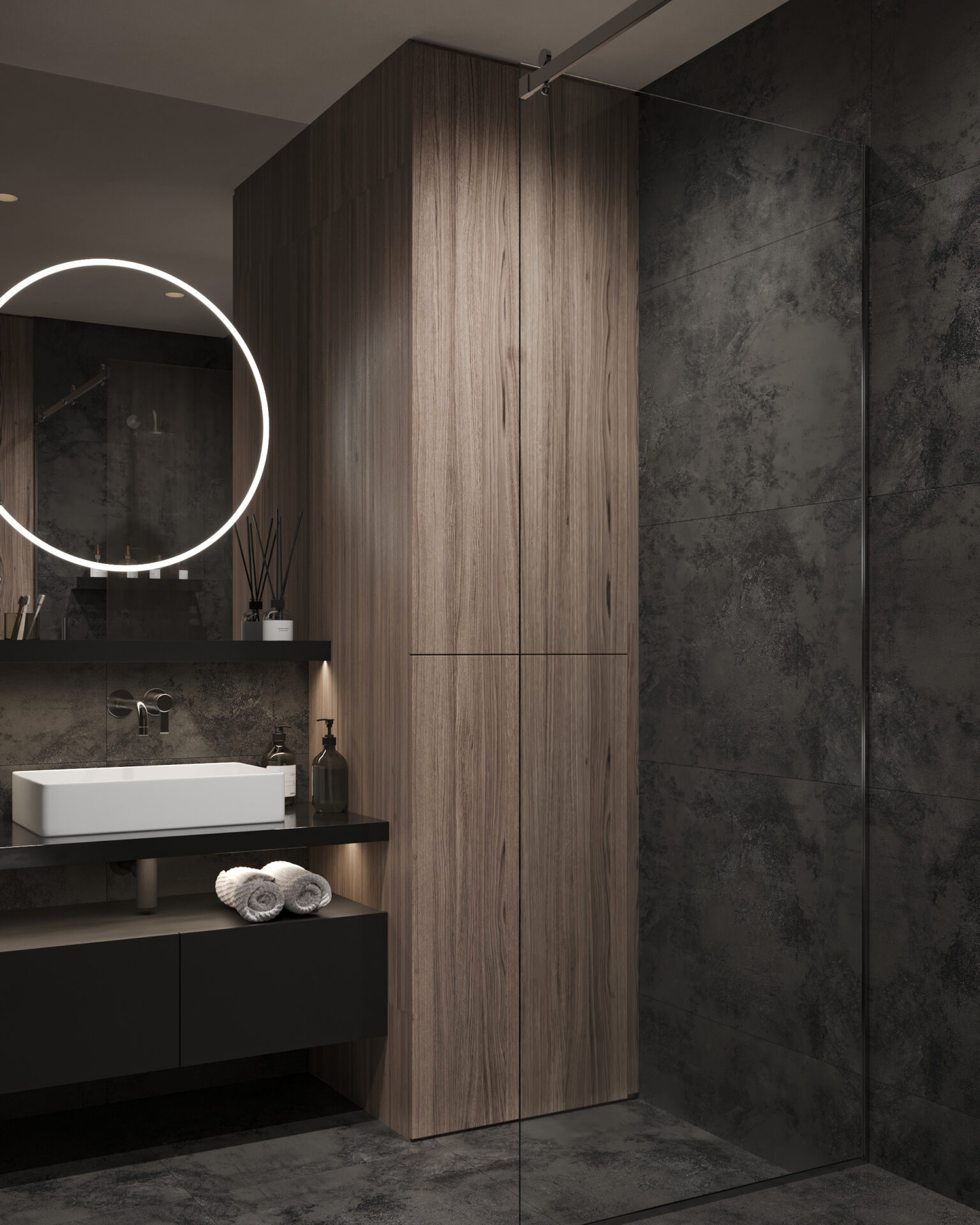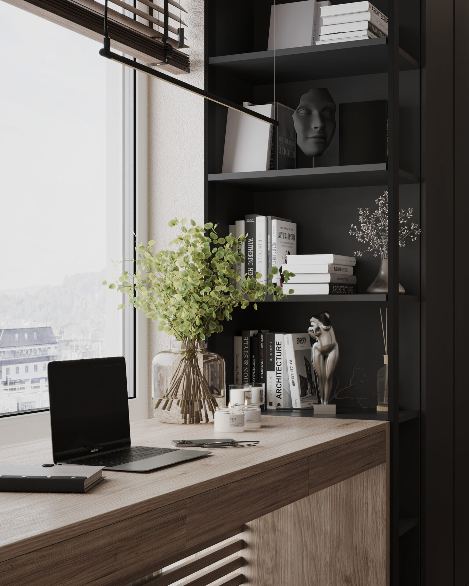 Світла кутова квартира з панорамними вікнами для молодої дівчини. Мінімалістична концепція інтер’єру поєднує світлі тони та контрастні акценти з темного дерева. Однак головною особливістю проєкту є його планування. Технічно, тут передбачені всі необхідні кімнати, але кожна з них виконана доволі цікаво та нестандартно.